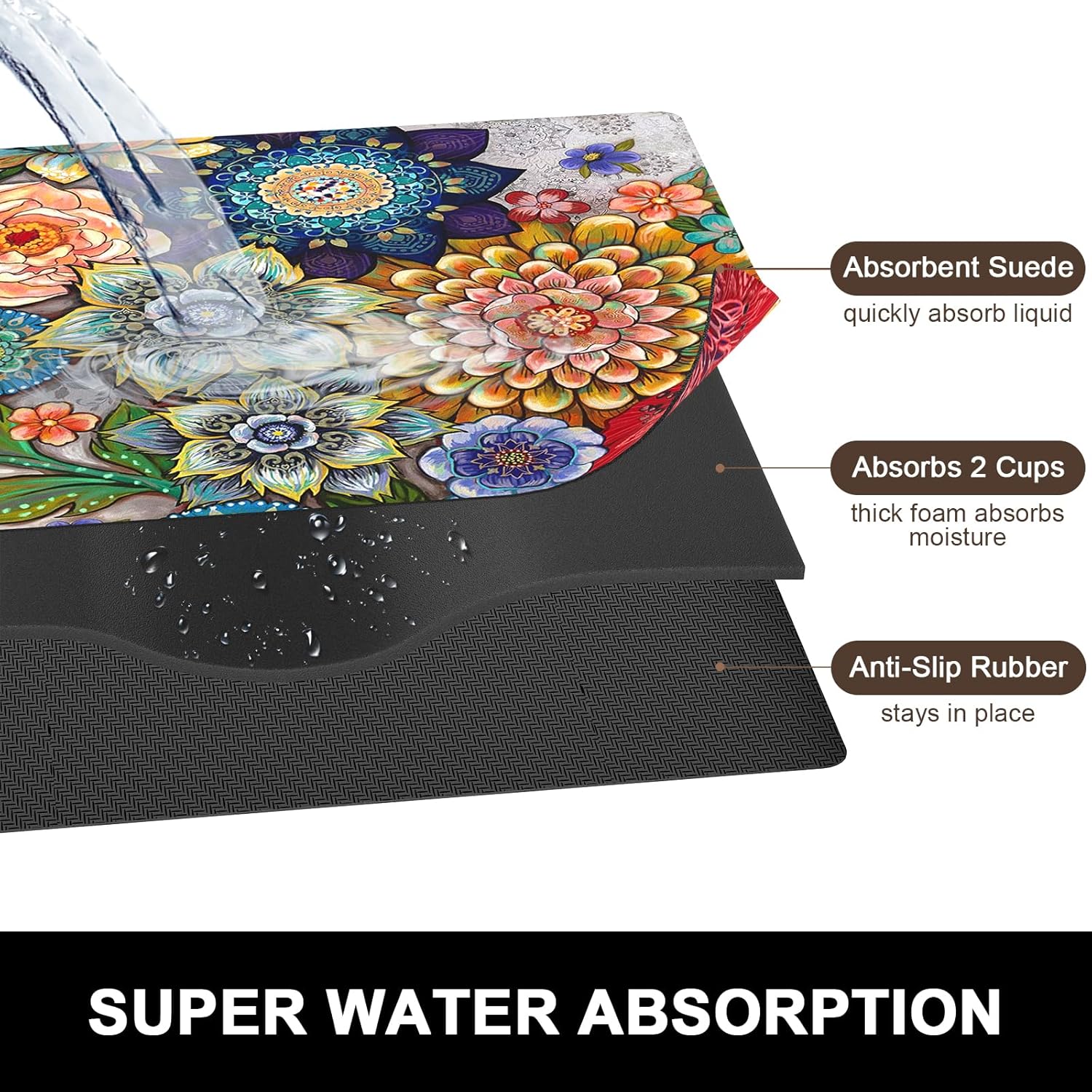 Rnivvi Dish Drying Mat for Kitchen Counter, 16 x 18" Cute Flower Theme Absorbent Heat Resistant Drying Pad with Non-slip Rubber, Coffee Bar Mats for Coffee Machine Dish Rack, Mandala Floral