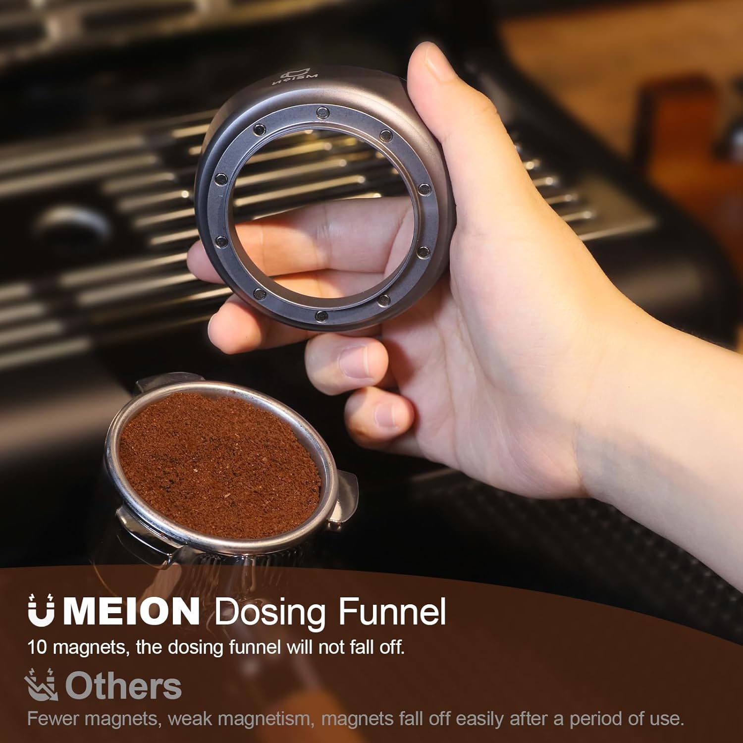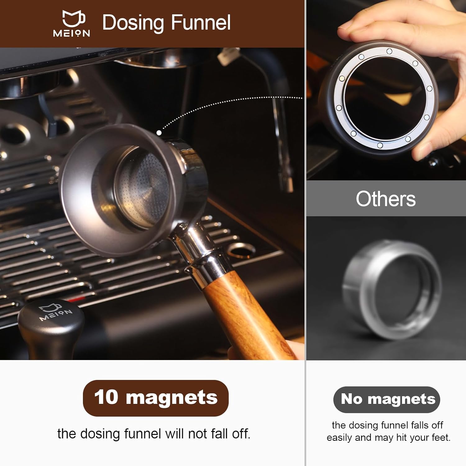 - Upgraded Magnetic Dosing Funnel - 10 magnets that hold the dosing funnel perfectly to the basket and won't fall off.