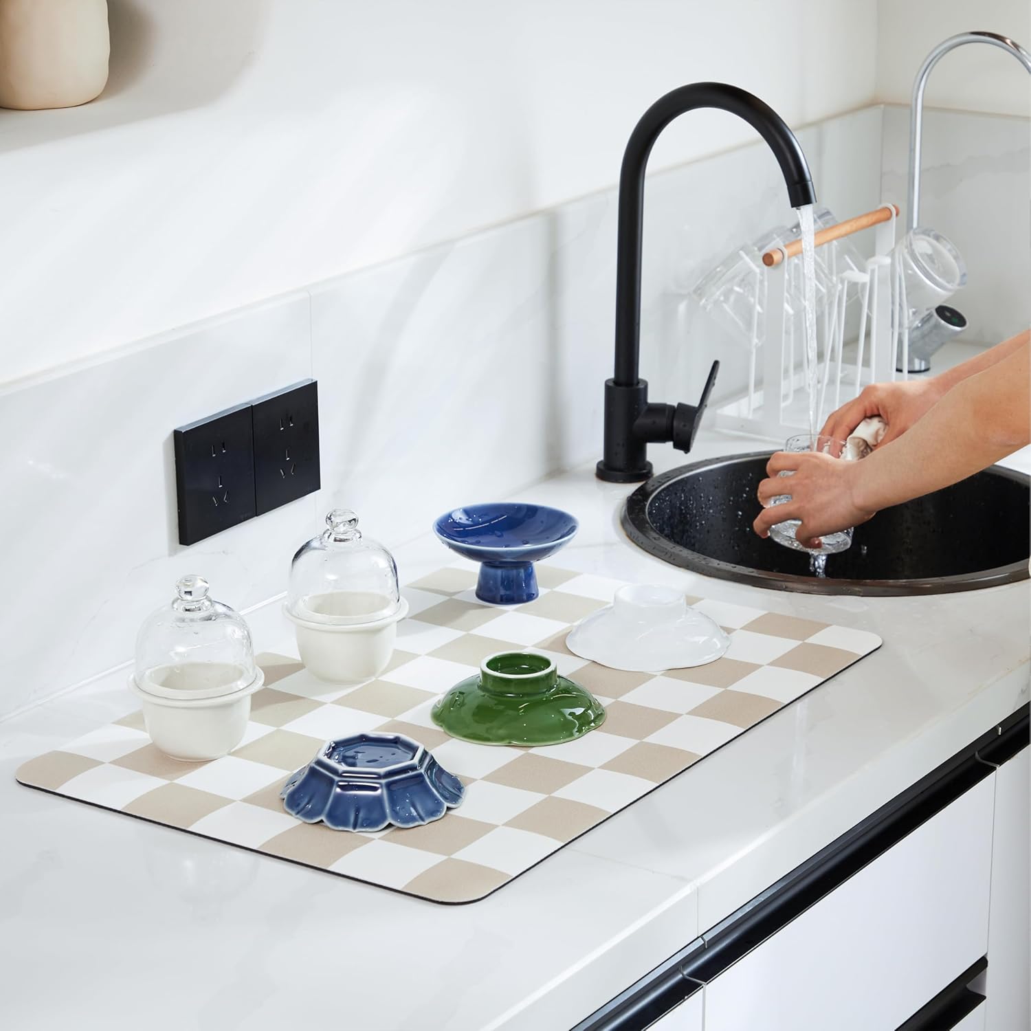 Checkered Dish Drying Mat for Kitchen Counter, Coffee Bar Station Accessories, Retro Cute Aesthetic Modern Absorbent Drainer Mat Kitchen Drying Mat Easy Clean, Beige 12" x 19"