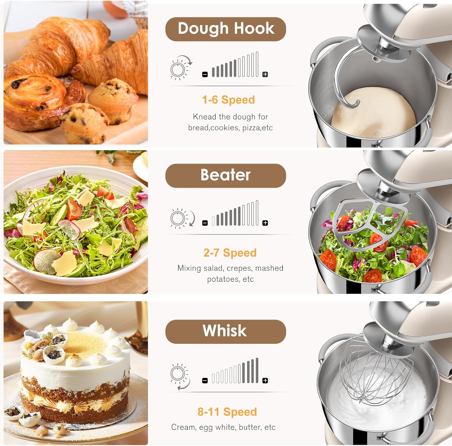 - Multiple Accessory Set: The stand mixer comes with mixing accessories - stainless steel dough hook, wire whip, flat beater, and 7.4QT capacity stainless steel bowl. All heights are adjustable to handle large & small quantities. It is your perfect kitchen accessory for frosting, meringue, creamy dressings, doughs, baked goods, and more.