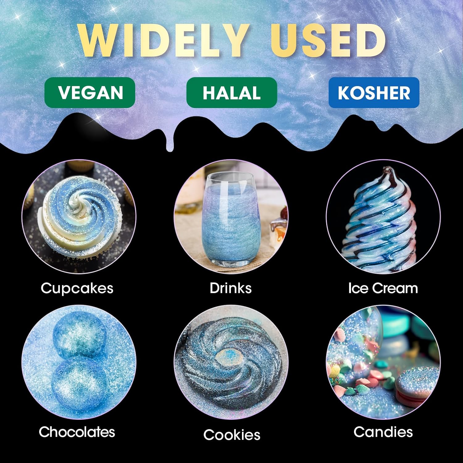 - ✔️【Vegan & Allergen-Free】Food-grade glitter uses only the highest quality vegan ingredients and does not contain common food allergens, including gluten, nuts or dairy products, so everyone can use and enjoy this product regardless of diet or food allergies. Unlike food contact glitter, these are 100% edible, so you don't need to worry about using them in your creations to make them sparkle for all.