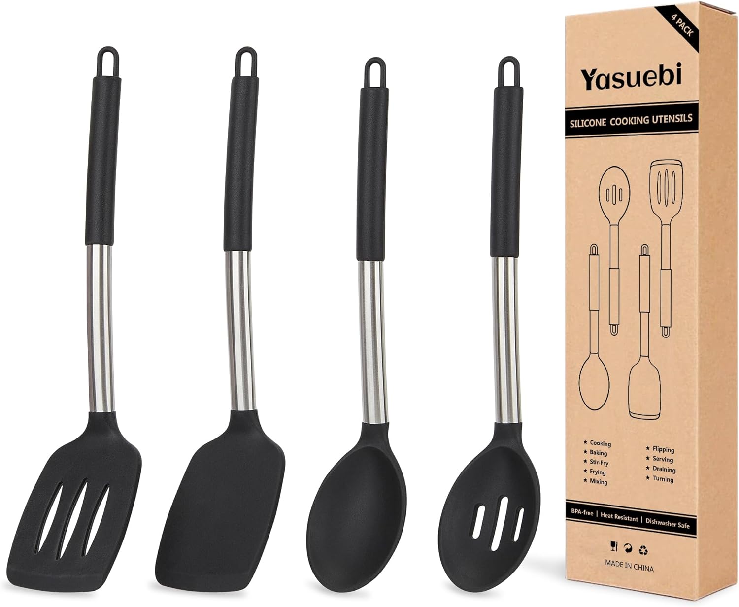 - Kitchen Cooking Utensils Set:Made of food-grade silicone, BPA-free, can use in any type of food.The silicone kitchen utensil set includes 4 pcs tools,two are spoons and the other two are spatulas,in black color.Meet your different needs.