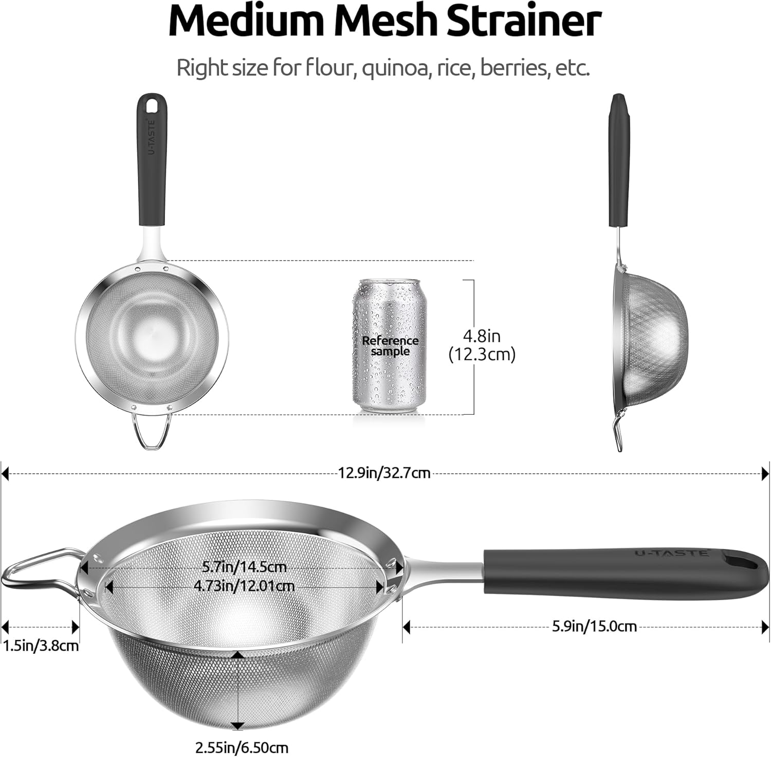 - [Versatile for Diverse Kitchen Needs]: Unsure about the right strainer size for different tasks? U-Taste small strainer with a 3.35-inch diameter mesh for tea, coffee, juice, spices, cocktails, cocoa powder, sugar powder, etc.. U-Taste medium strainer a 5-inch diameter mesh for flour, quinoa, rice, cereal, berries, etc..