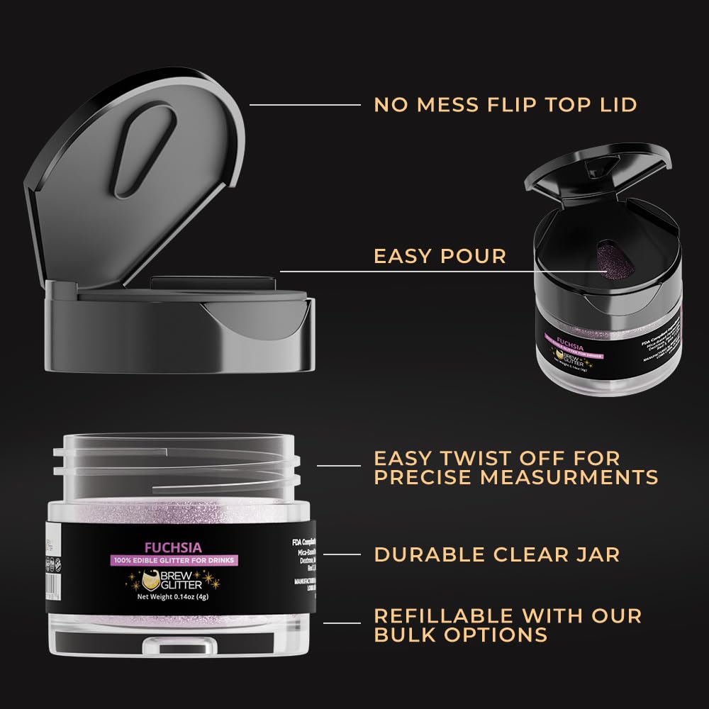 - š« A swirl of fuchsia edible drink glitter infuses glitter and color into any beverage. Open the flip top, pour in Brew Glitter, stir, and watch it shine!