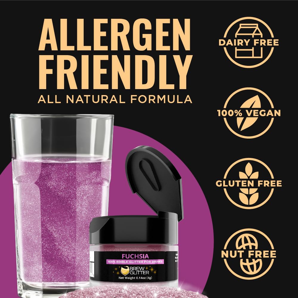 - šæ Brew Glitter fuchsia drink glitter is made in the USA at SQF III, GMP, Halal, and Kosher certified facilities, and is nut-free, gluten-free, and vegan.