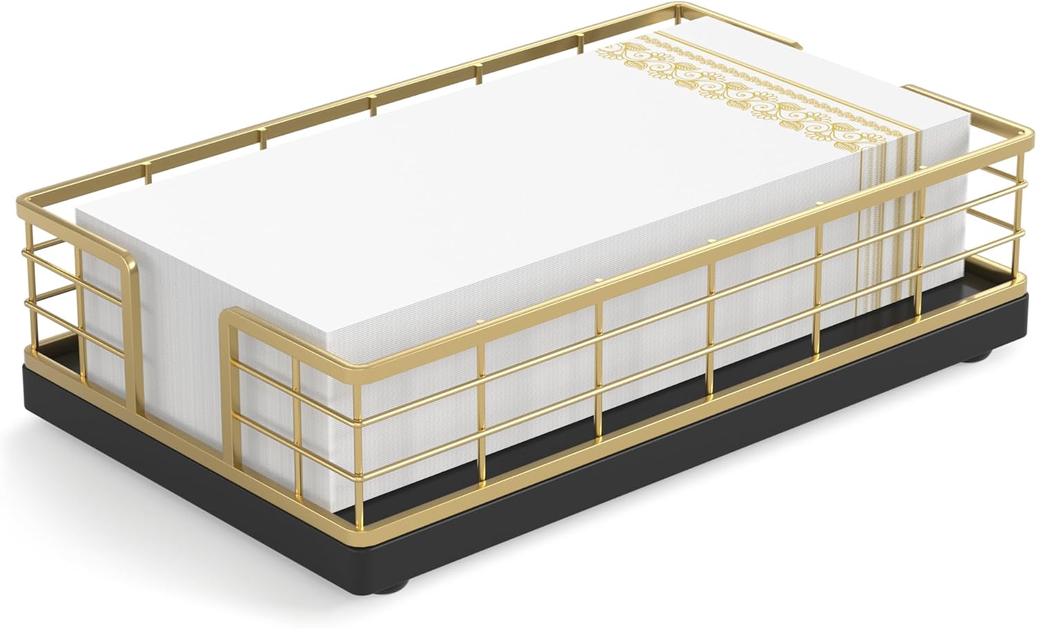 Wican Guest Towel Holder Tray for Bathroom, Oak and Iron Napkins Holder for Powder Room Dinning Table Wooden Basket for Disposable Paper Hand Towels Gold and Black
