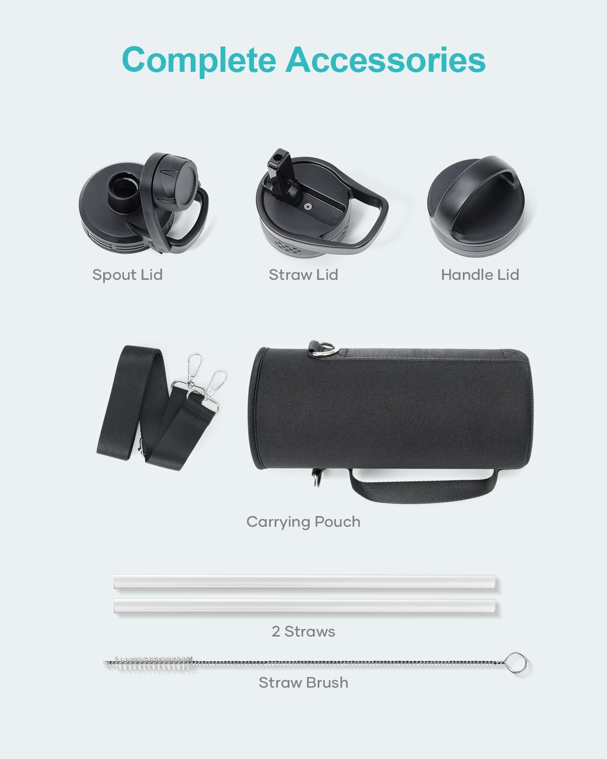 - Super Deal Combo: Buy 40oz insulated water flask, get 7 accessories. The pack includes 1 x carrying pouch, 3 x lids, 2 x straws, and 1 x straw cleaner. This bottle is ideal for camping, hiking, cycling, running, gym sessions, or outdoor work, ensuring you stay hydrated wherever you go.