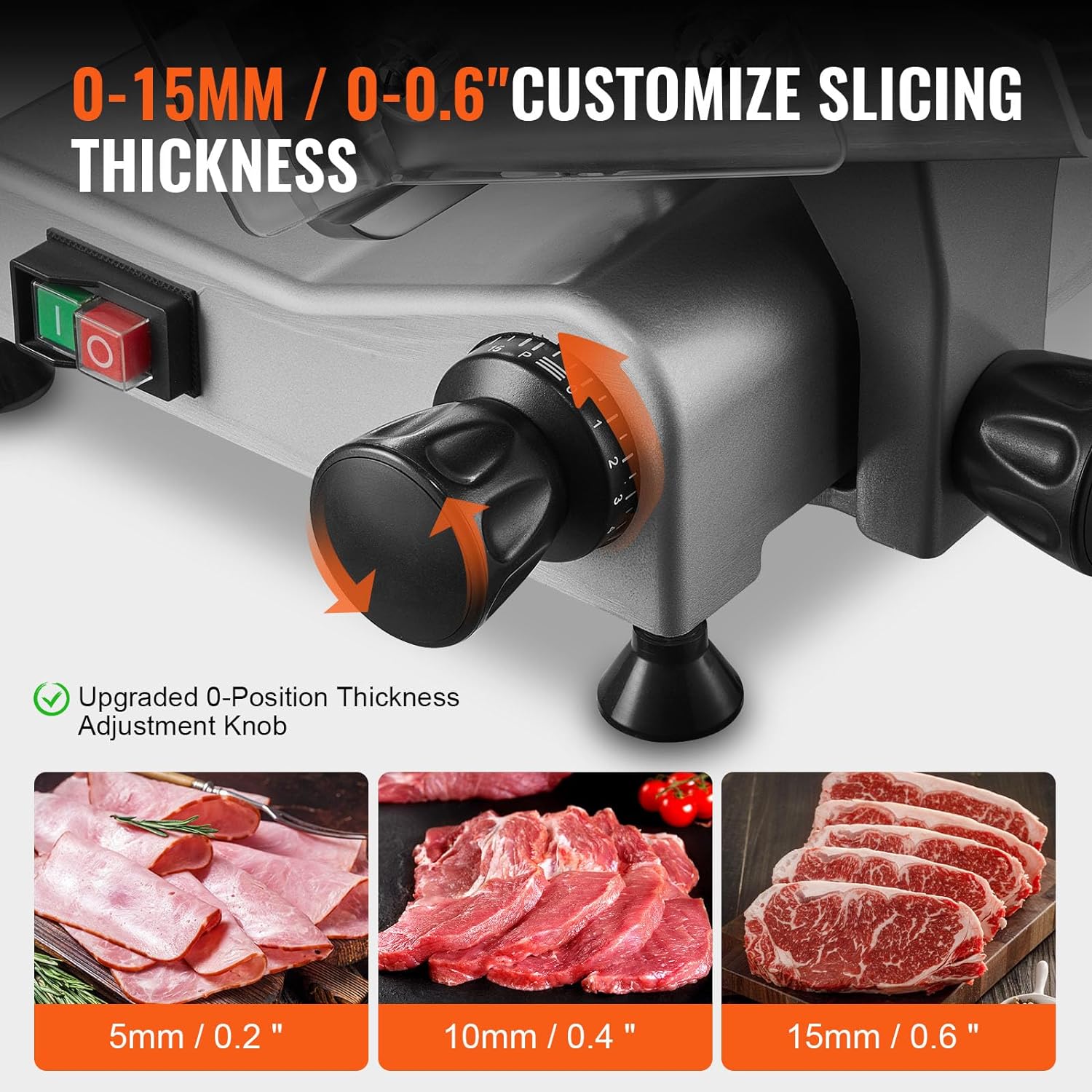 - Adjustable Thickness: The deli meat slicer features a thickness adjustment knob with a range from 0-15mm (0 - 0.6 inches). You can easily customize the thickness to meet your preparation needs, perfect for making hamburgers, sandwiches, cold cuts, fruit platters, and more.