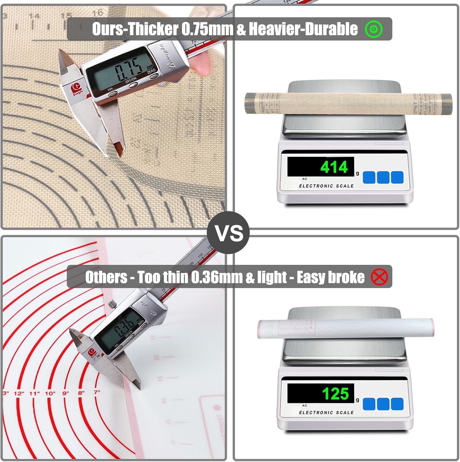 - 【Double Thickness and Durable Silicone Mat】: It is a level up pastry mat. The thickness of our silicone baking mat is 0.75 MM, which is almost twice thicker than other baking mats(0.3MM). We added the material of fiberglass to reinforce the mat. Our silicone pad will stay good on the table and not wrinkle when used. Ultra large size(34×26 inches) pastry mats designed, which prevent the flour or fondant will be spilled on the table