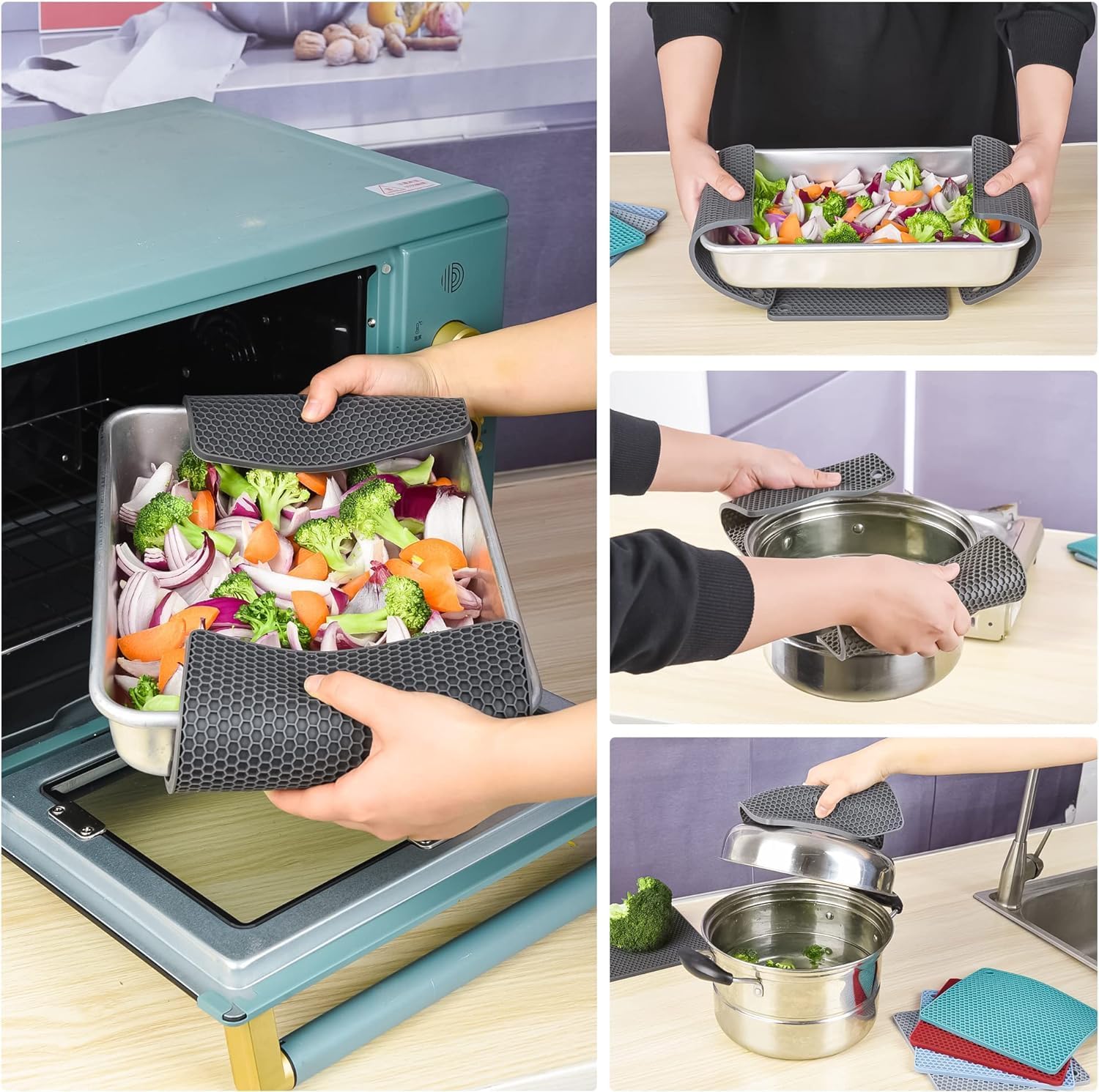 - ★ MULTI FUNCTIONAL TRIVETS MATS-Our navy silicone trivets is non-slip, flexible and soft enough to comfortably grab a hot dish or pan, open the can, drying mat or placemat. No need to worry your kitchen counter or tables. Use it as a trivet, silicone trivet, hot pad, hot mat, pot mat, protector, silicone pot holders, jar opener, spoon rest.