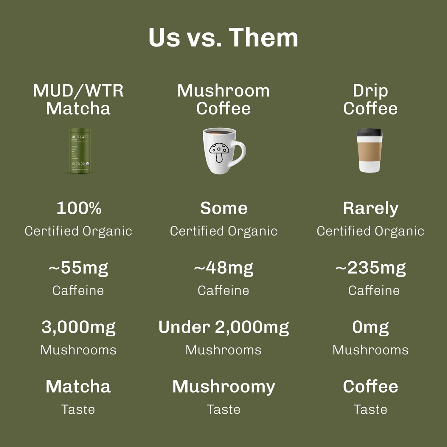 - WHAT DOES MUDWTR DO DIFFERENTLY - Functionality & benefits are prioritized over everything else with MUDWTR. With 3,000mg of USA grown beneficial mushrooms and 55mg of caffeine, a fraction of what is found in a cup of coffee, our USDA Organic matcha powder delivers laser focus without the brain fog. We all love a good cup of coffee, but without as much caffeine, this mushroom coffee alternative gives you more benefits, without jitters, crash or dependency
