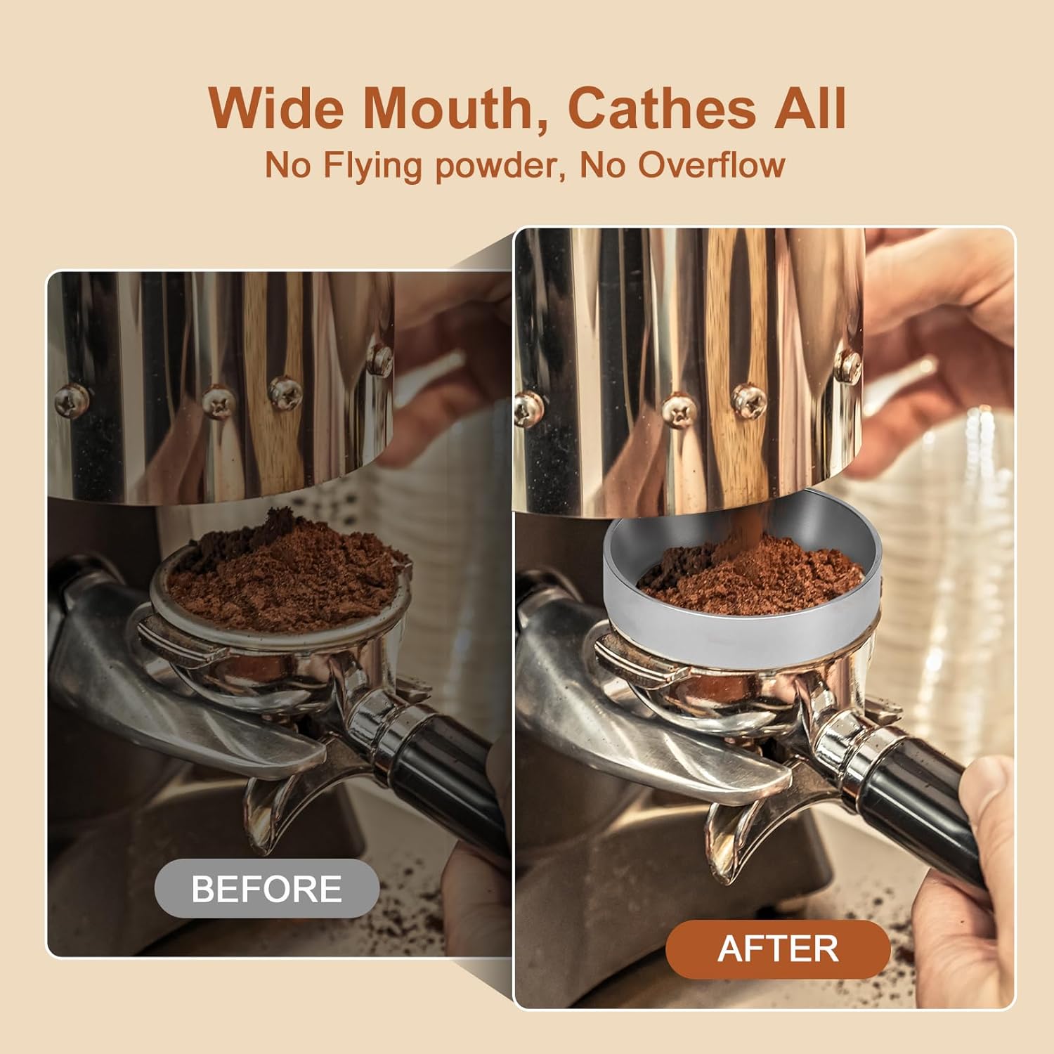 - **Premium Aluminum Construction:** Crafted from high-quality aluminum material, this coffee dosing ring is LONG LASTING and lightweight, providing excellent stability during the tamping process while resisting rust and wear from daily coffee preparation routines.