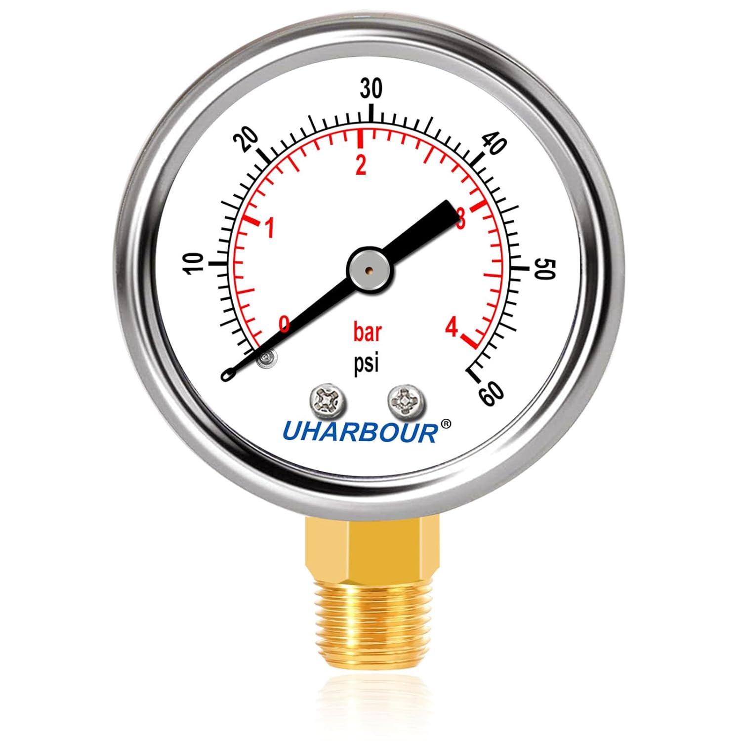Lead-Free Water Pressure Gauge Liquid Filled 60 Psi 2" Dial, Stainless Steel Case, 1/4" NPT Lower Mount, Water Pressure Gauge for Home