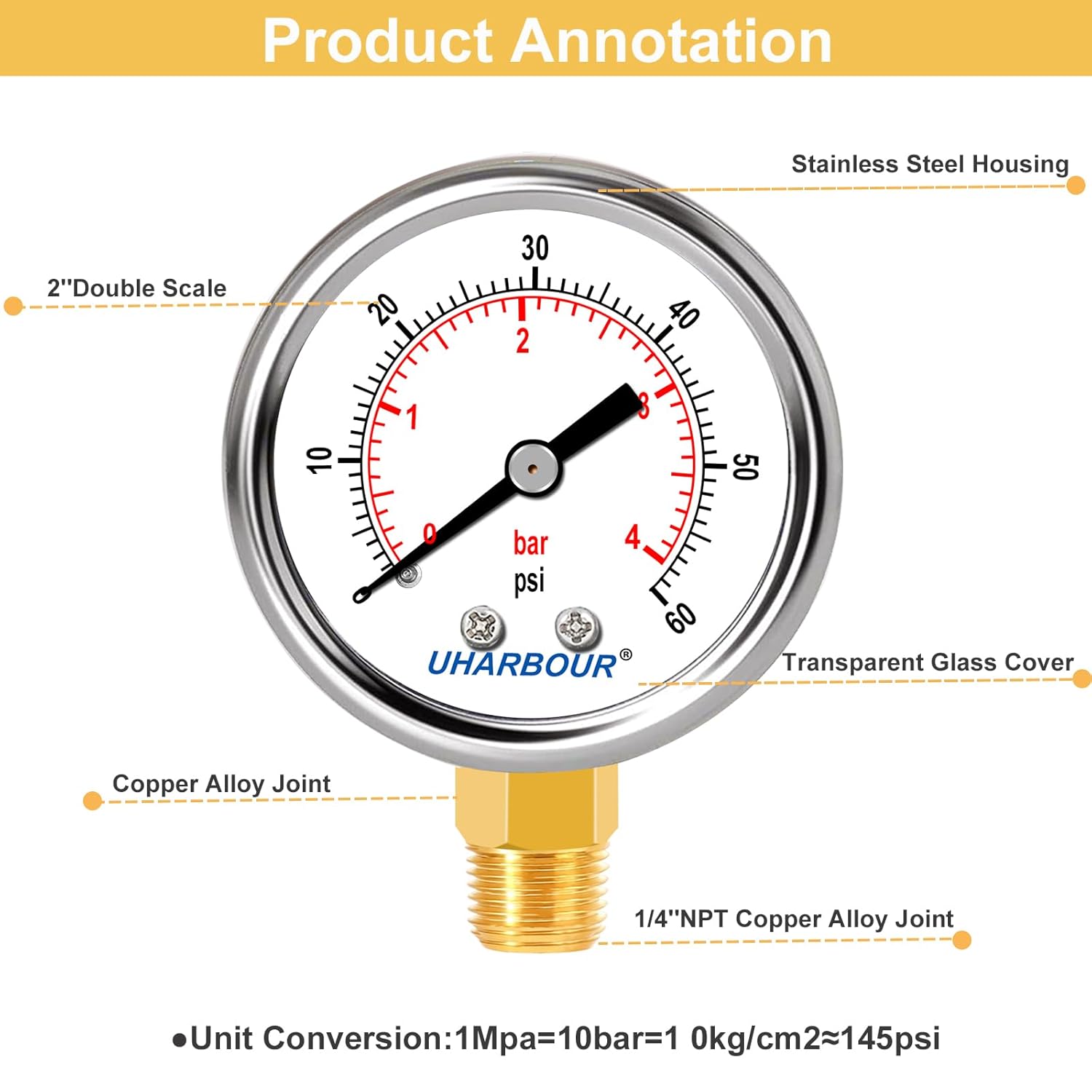 - 4. With a 1/4" NPT lead-free brass lower mount, this pressure gauge is easy to install and fits securely on different systems and equipment.