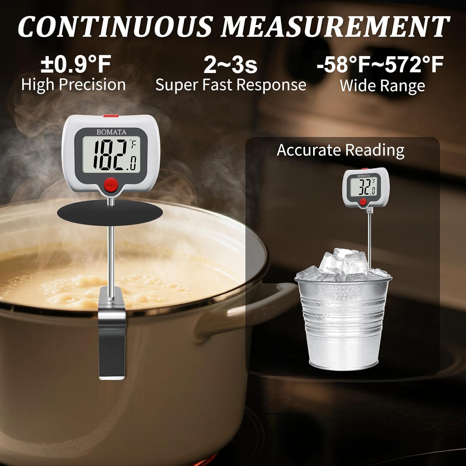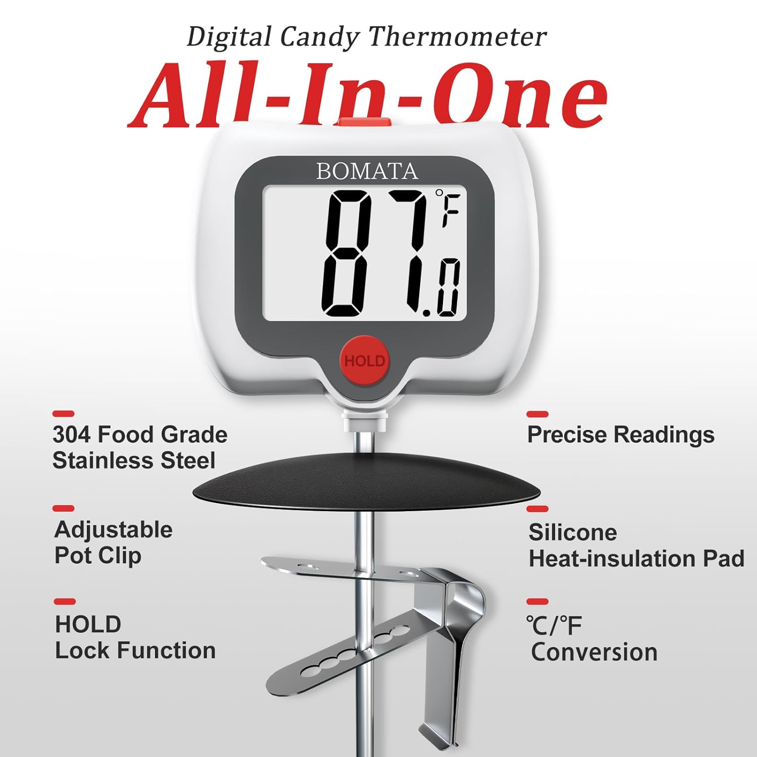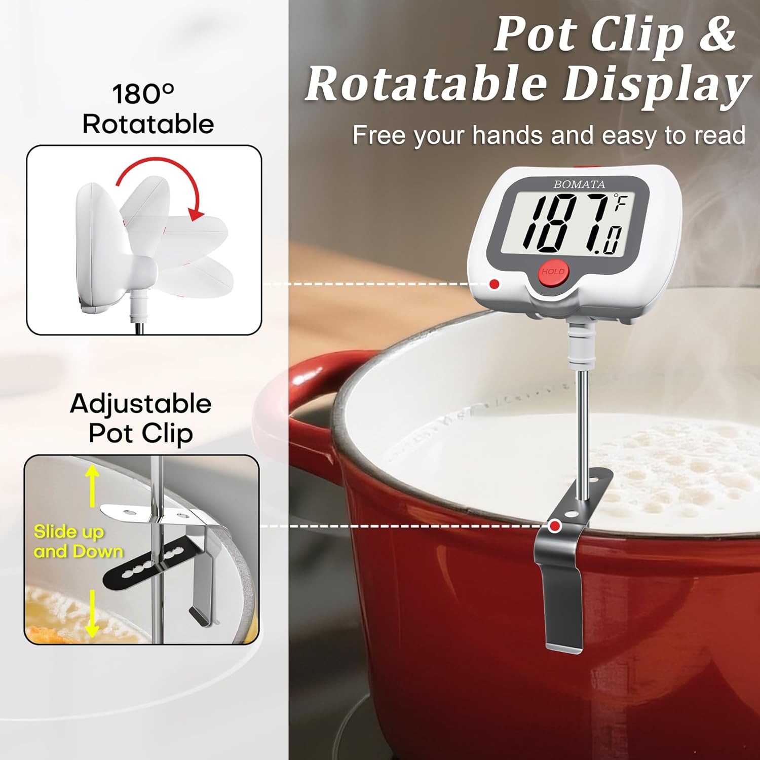 BOMATA Digital Candy Thermometer with Pot Clip, Deep Fry Oil Thermometer with Rotatable Display & Long Probe, for Candy Candle Making, Cooking, Food, Liquids, Water, Sugar.. White