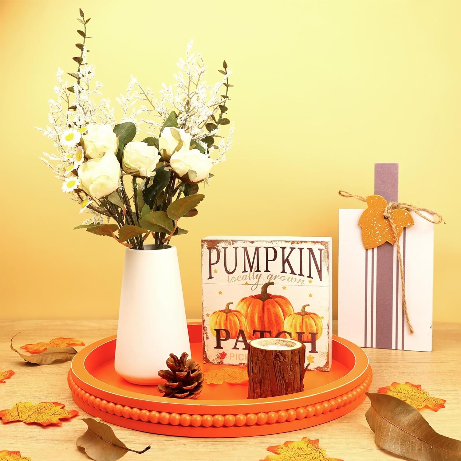 Round Orange Wood Serving Tray with Beads, Wooden Decorative Tray for Entertaining, Decoration, and Gifting,