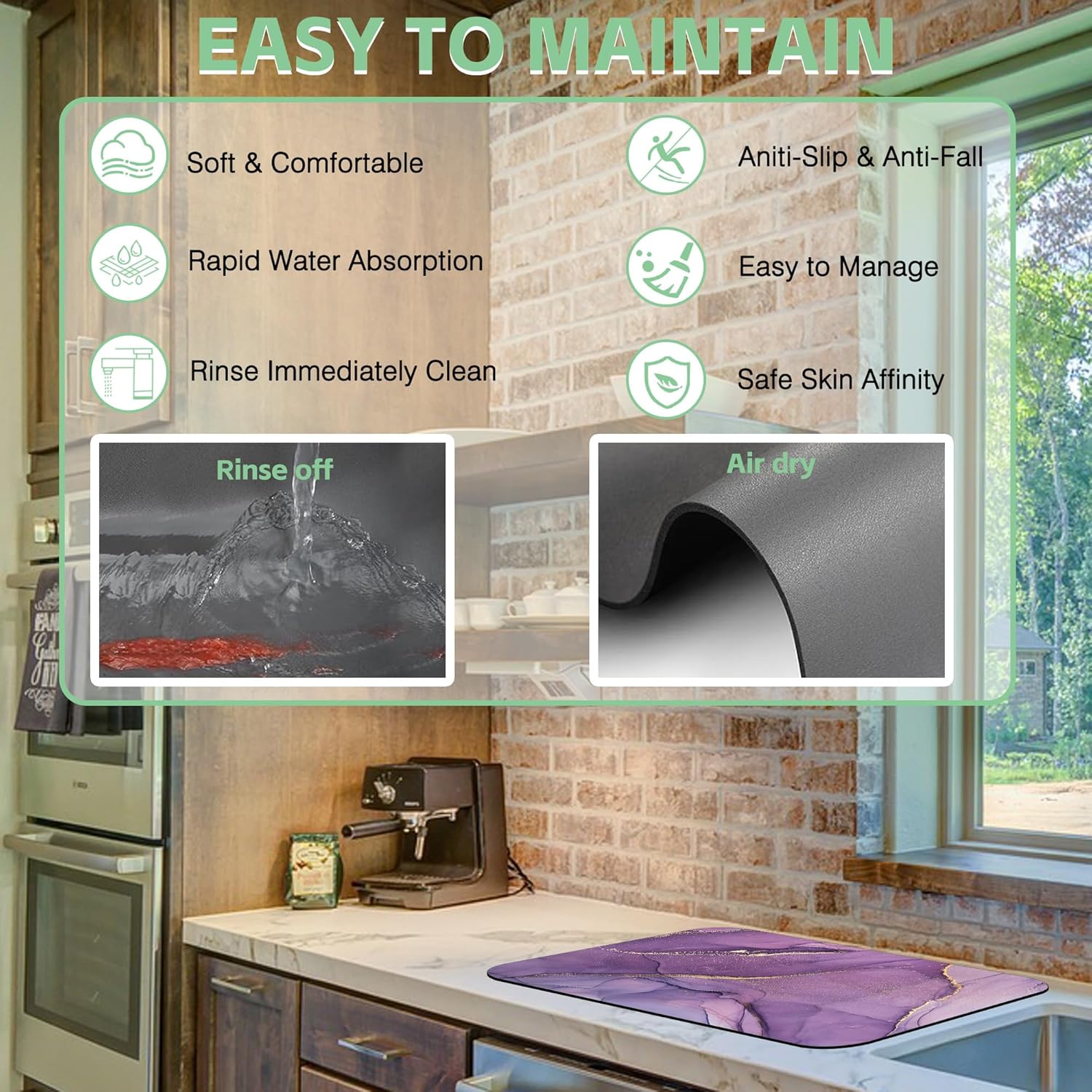 - 【Super Absorbent and Non-slip】The dish drying mat is made of absorbent suede and non-slip rubber. The surface is soft, wear-resistant and heat-resistant, and can quickly absorb water droplets from dishes. The non-slip textured rubber backing can firmly grip the counter, and dishes, water cups, coffee machines and kitchen utensils will not slide when placed on it. Perfect as a kitchen or coffee bar accessory.