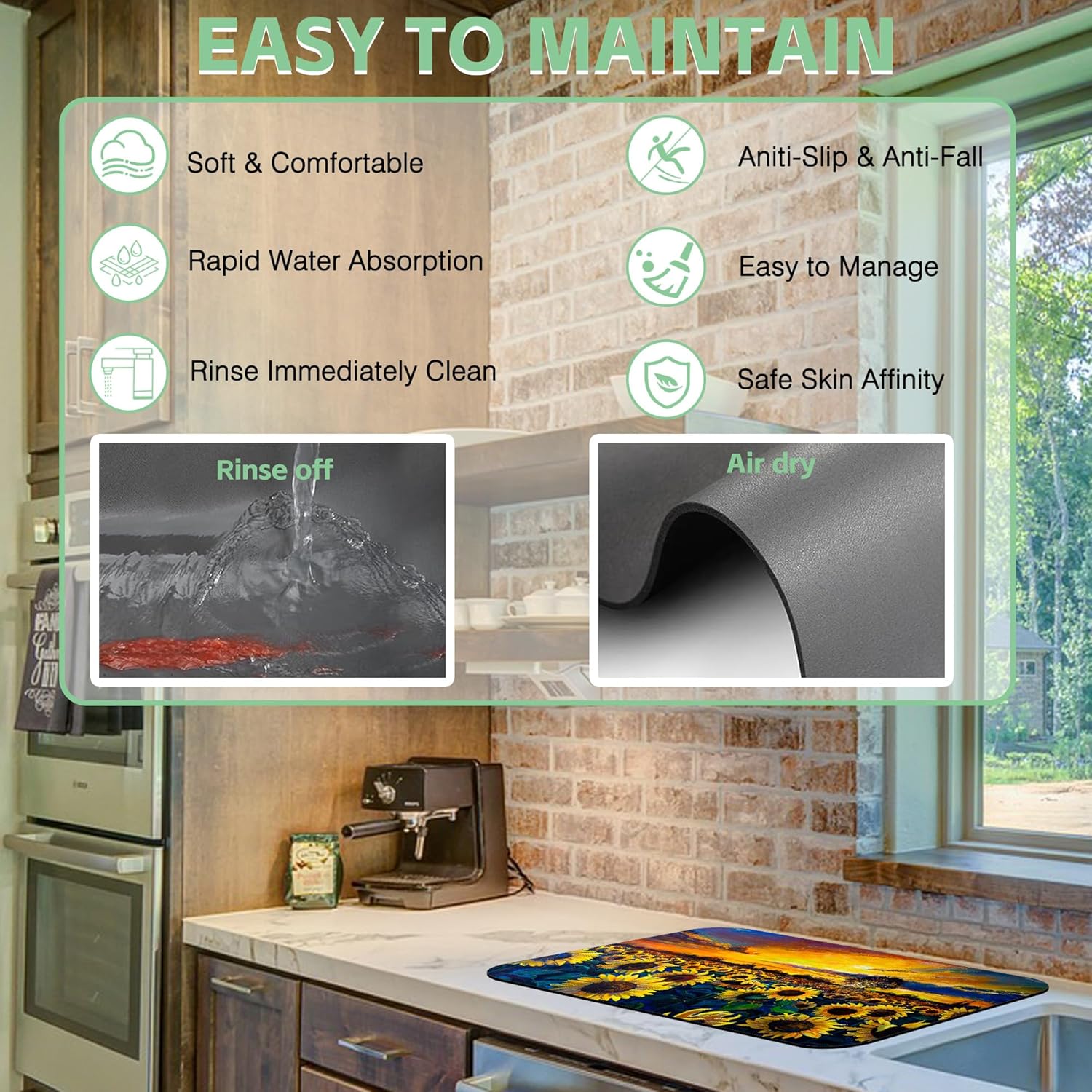 Sunflower Field Dish Drying Mat,12"X19" Absorbent Fast Dish Drying Mat for Kitchen Counter Pot and Pan, Kitchen Accessories