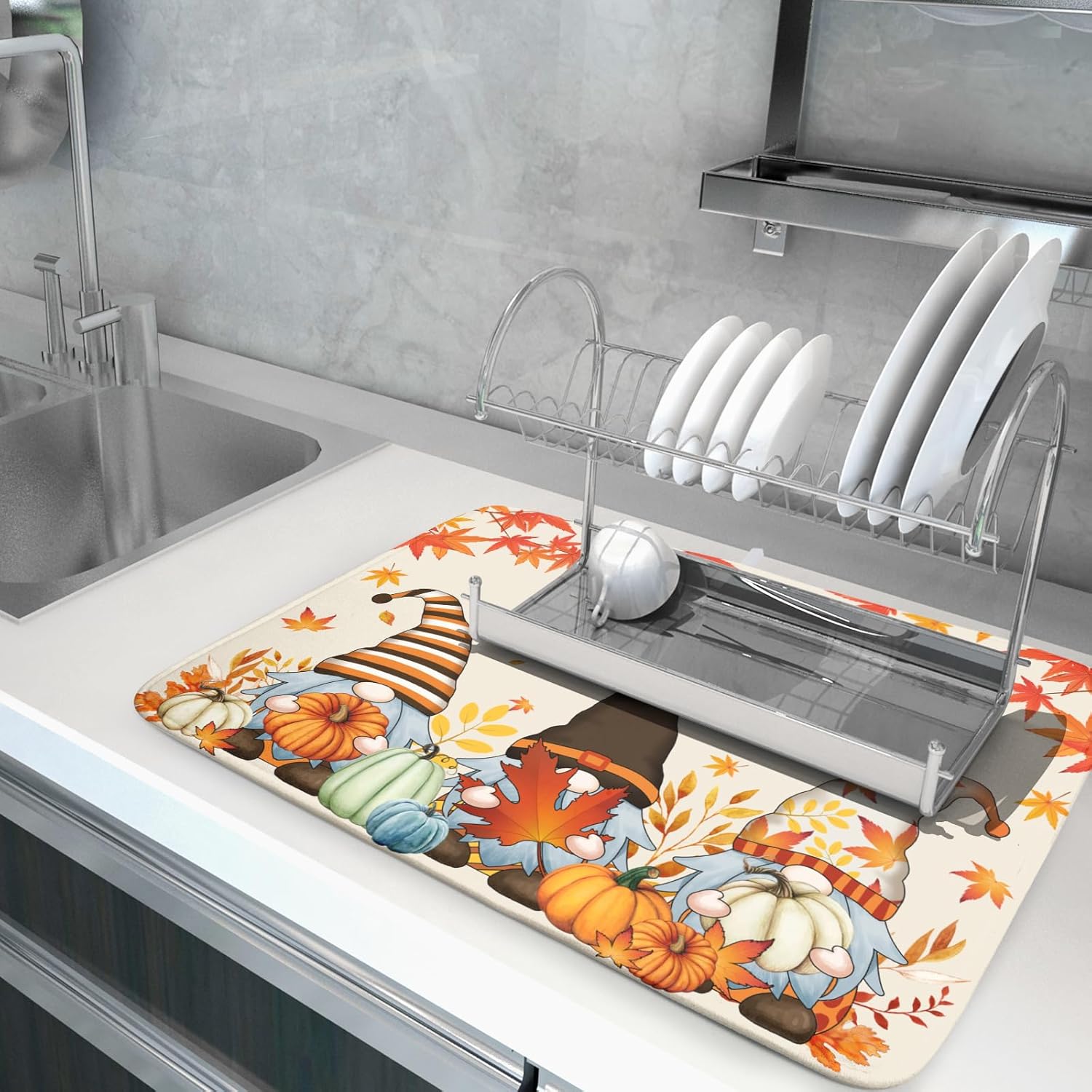 - 【Fashion Design】Our Fall drying rack mats are customized with single-sided printing, one side is takes fall as the theme, printed with fall gnome pumpkin patterns, create a strong seasonal feeling. Exquisite printing and bright colors make the kitchen more vivid and fashion, which is durable and does not fade, perfect functional addition to your kitchen decor. Also a great gift for your family and friend, housewarming parties, weddings, birthdays and other special occasions.