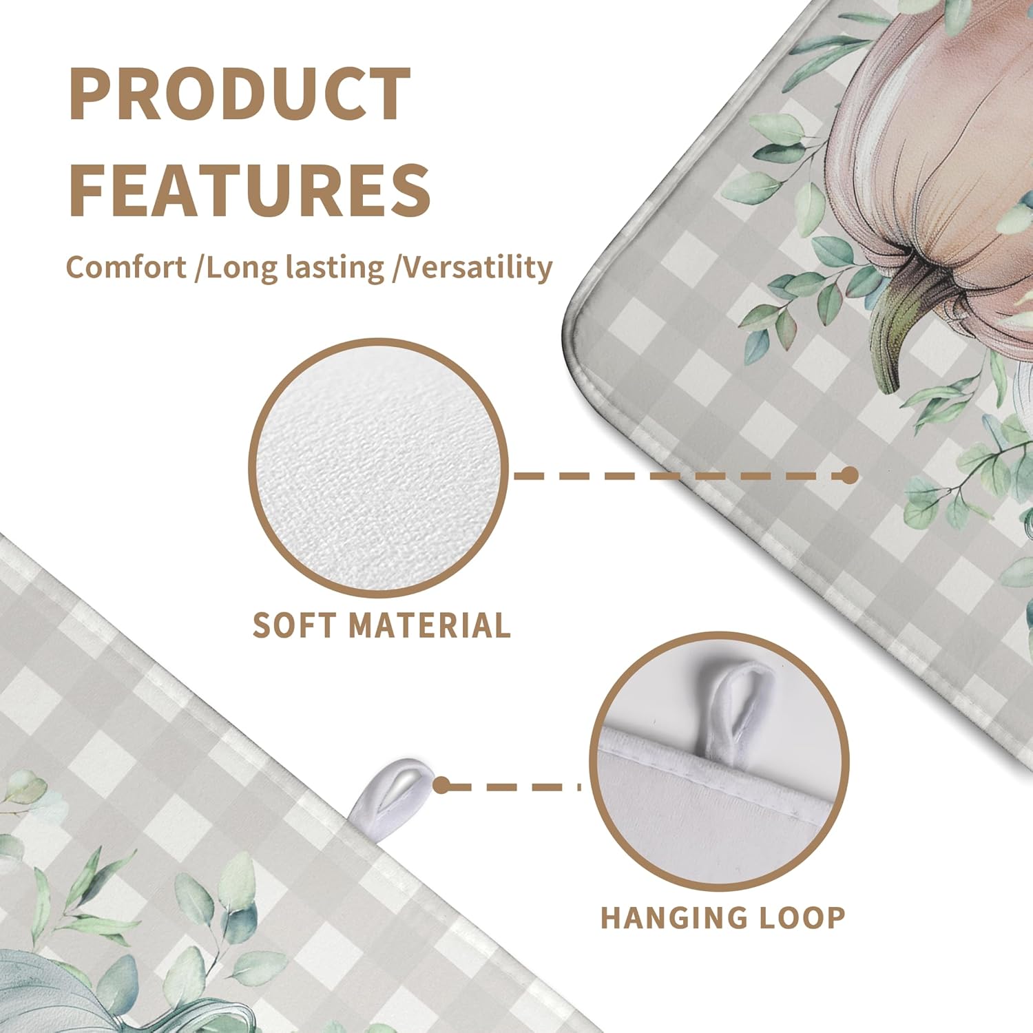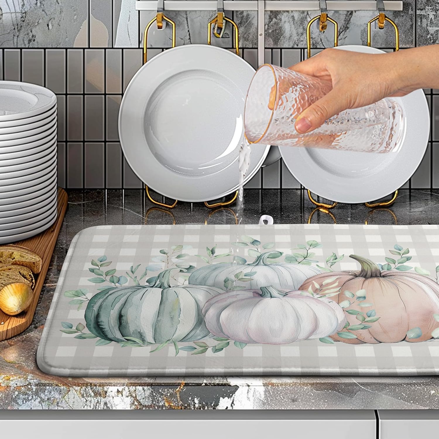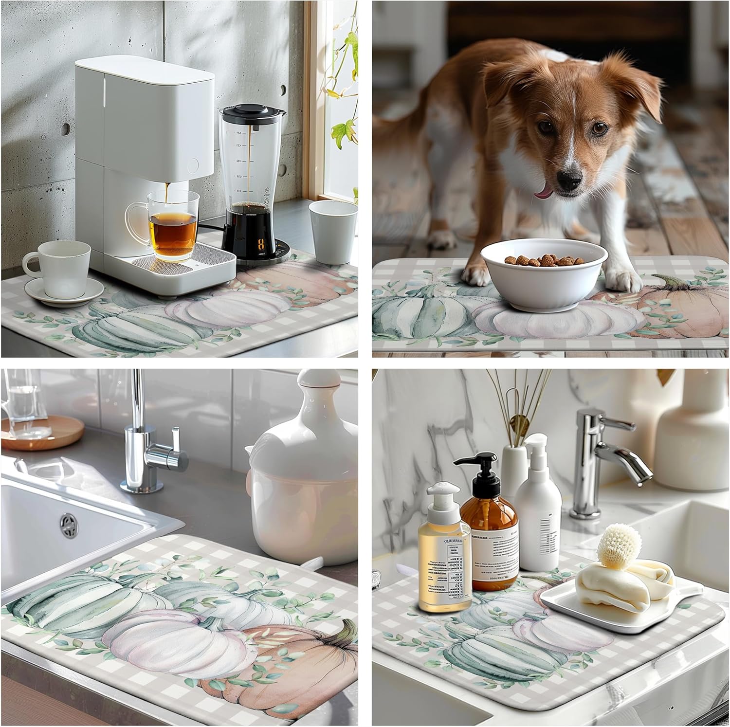 - [Multi-functional]: This Thanksgiving Fall pumpkin white check plaids dish dryer mat can be placed under the dish rack to collect dripping water to keep the counter dry and clean, or you can place bottles, pots, plates, bowls, cups and other utensils directly on the mat. Thanksgiving Fall pumpkin dish drying Pads can also be placed under the coffee machine to absorb spilled coffee.