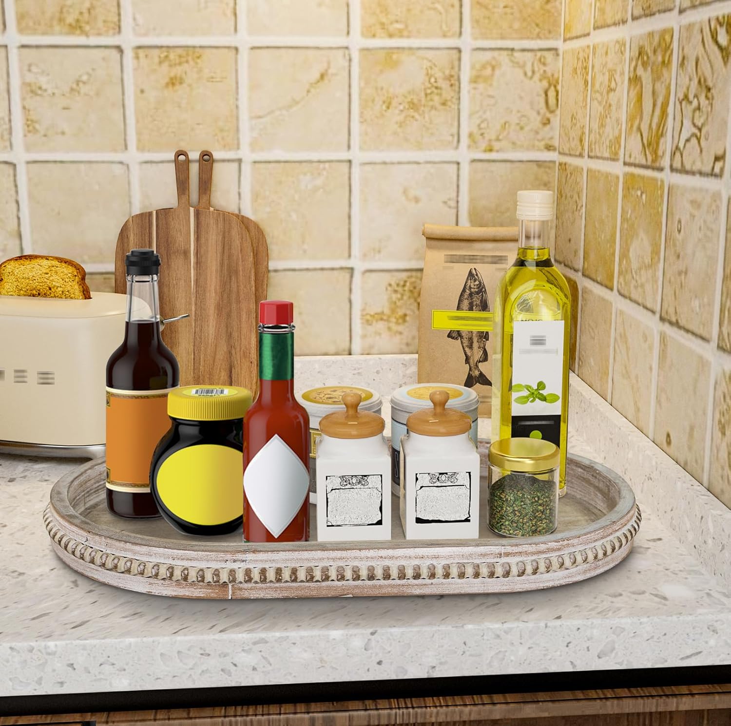 - REFINED AND ELEGANT: Oval serving tray is washed white finish and the edges are decorated with wooden beads, the distressed surface gives it a homey vintage feel. The overall appearance is unique and exquisite that goes well with many types of decor, create a fun centerpiece for your space.