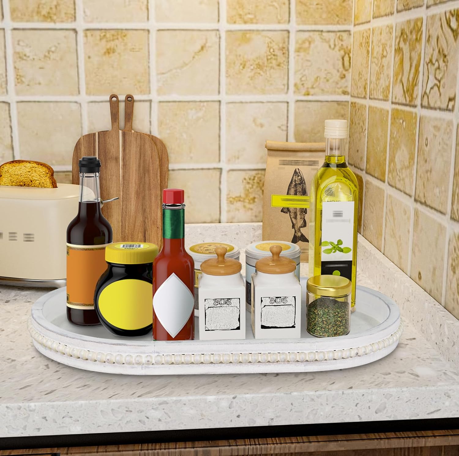 - REFINED AND ELEGANT: Oval serving tray is washed white finish and the edges are decorated with wooden beads, the distressed surface gives it a homey vintage feel. The overall appearance is unique and exquisite that goes well with many types of decor, create a fun centerpiece for your space.