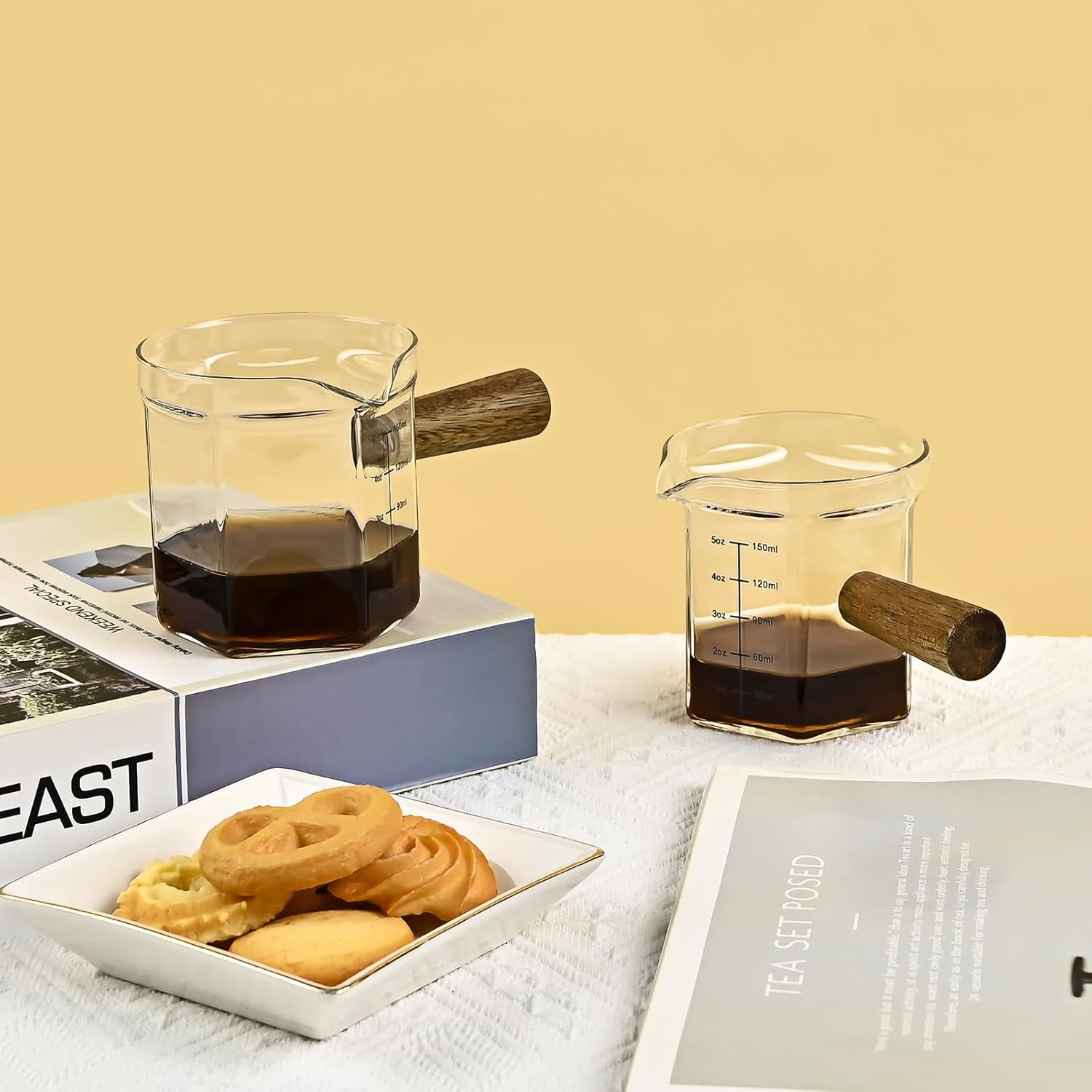 Glass Measuring Cup, 5oz Clear Espresso Shot Glass with Wood Handle, Double Spouts Measuring Triple Pitcher Milk Cup for Coffee Tea (Transparent)