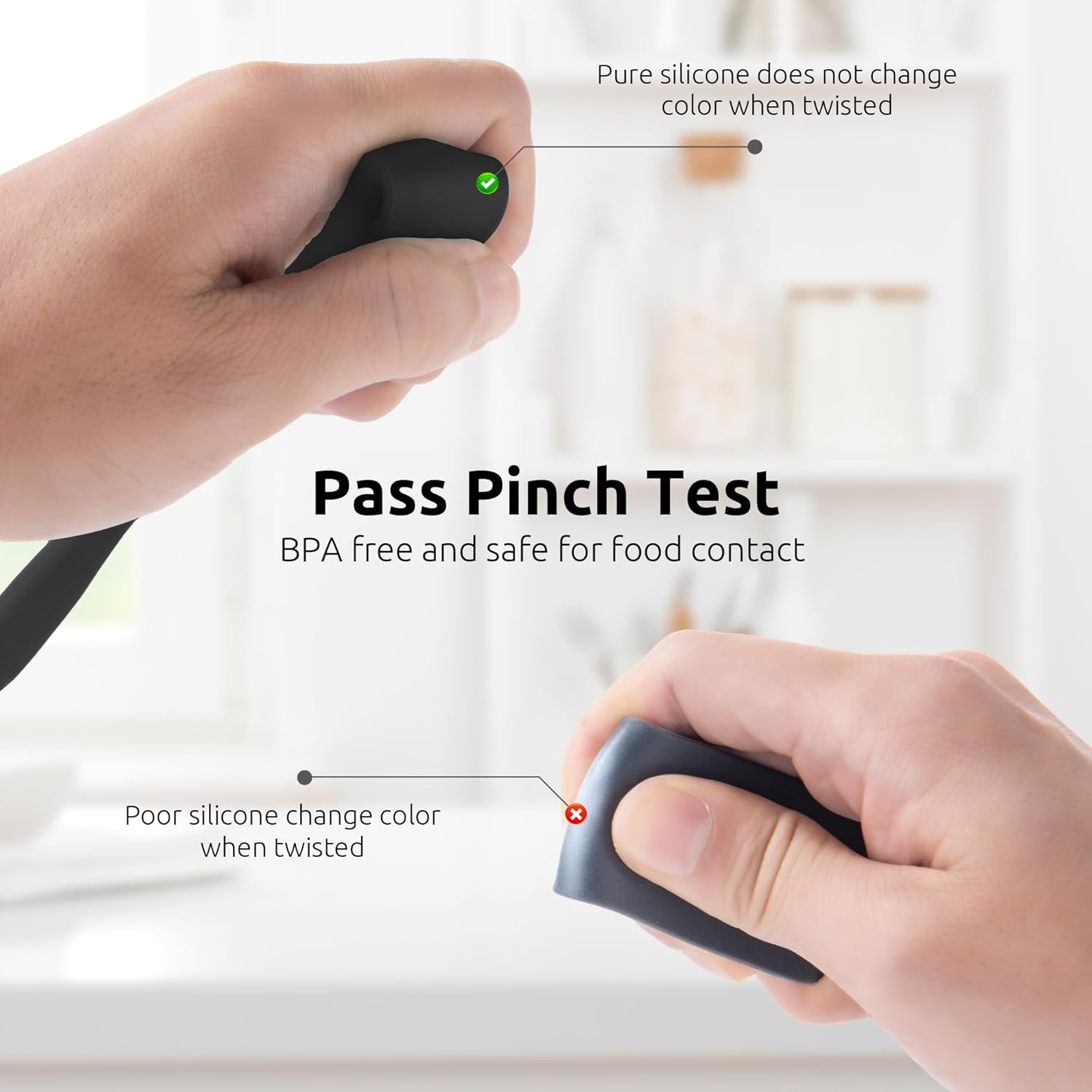 - [600℉ High Heat Resistant] U-Taste silicone jar spatula passes the pinch test, ensuring it’s completely safe for food contact. It's high heat resistant up to 600℉, making it work for handling high-heat tasks such as stirring sauces or cooking peanut brittle. This feature ensures the silicone spatula will not melt with high heat cooking and baking. The long handle also keeps your hands safe from heat. You can use it daily for your non-stick cookware as it will not damage the coating of your pan.