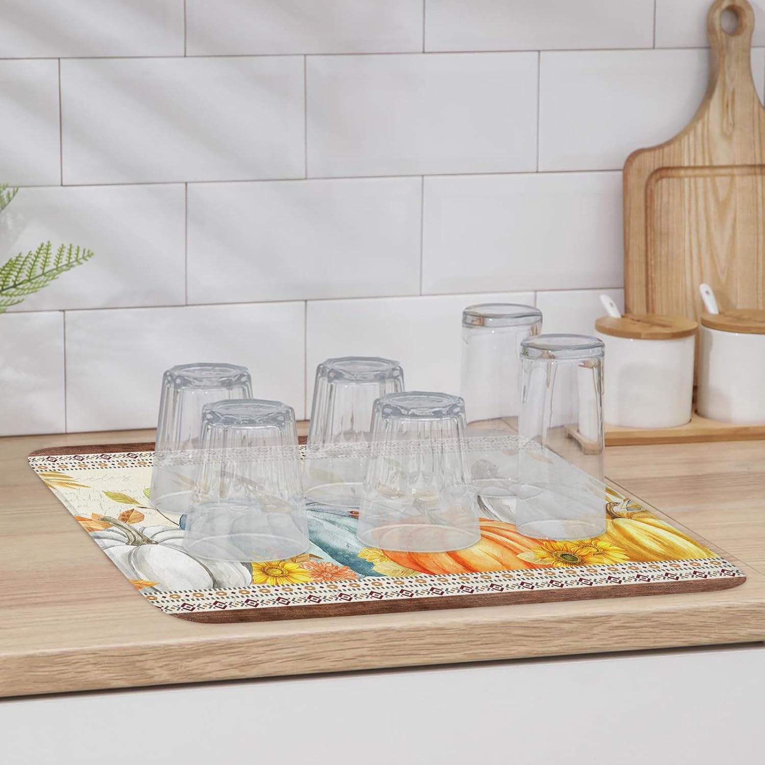 Fall Dish Drying Mat for Kitchen Counter Pumpkin Drying Pad Absorbent Drying Mats for Countertops Sinks Draining Racks Sunflower Eucalyptus Leaves Drainer Holiday Harvest Thanksgiving Decor 18x24