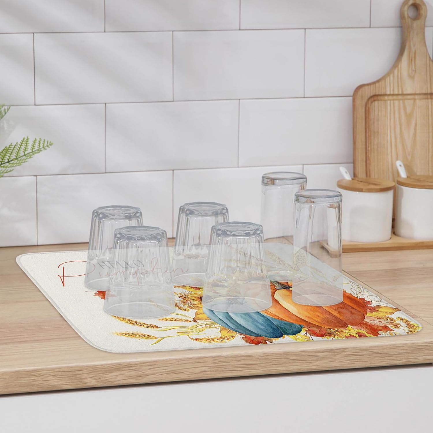 Fall Dish Drying Mat for Kitchen Counter Hello Pumpkin Drying Pad Absorbent Drying Mats for Countertops Sinks Draining Racks Sunflower Ears of Wheat Drainer Holiday Harvest Thanksgiving Decor 16x18