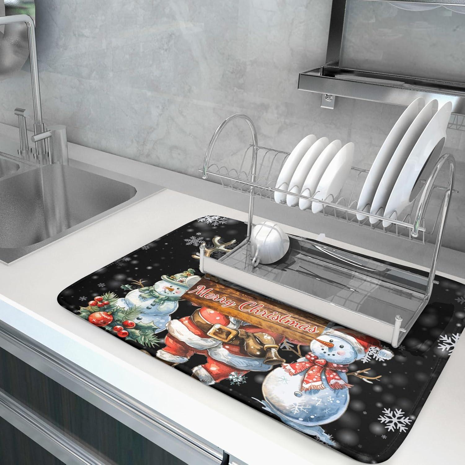 Christmas Santa Snowman Dish Drying Mat 18x24 Inch Winter Xmas Snowmen Santa Drying Mat Absorbent Drainer Pad for Kitchen Counter Christmas Tableware Mats Protector for Black Home Kitchen Accessories