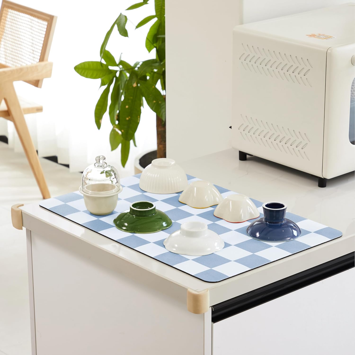 Checkered Dish Drying Mat for Kitchen Counter, Coffee Bar Station Accessories, Retro Cute Aesthetic Absorbent Coffee Mat Kitchen Drying Mat Easy Clean, Blue 12" x 19"