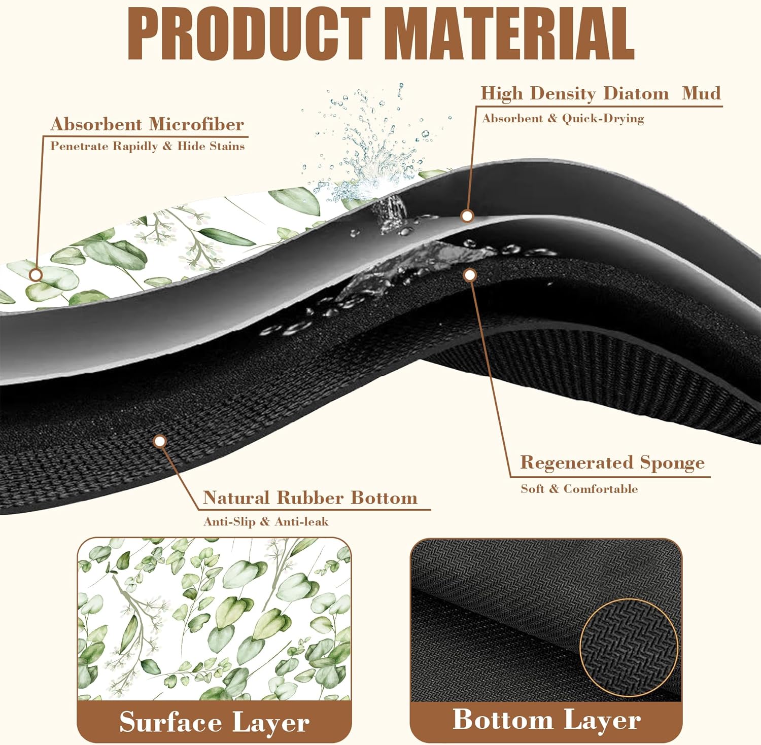Eucalyptus Leaves Dish Drying Mat for Kitchen Counter Bar Mat Hide Stain Absorbent Rubber Backed Coffee Mat Coffee Maker Espresso Machine Accessories 11.8 x 19.7 Inch