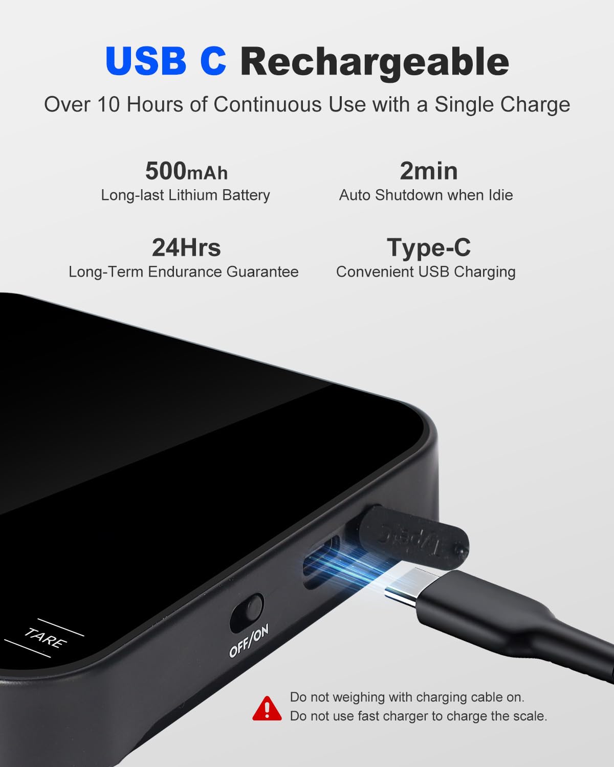 - Long Battery Life: This small coffee scale has a built-in 500mah rechargeable lithium battery, complimentary type-C usb charging cable (you need to prepare your own charging head), and with low battery reminder, when the low voltage icon "LO" appears on the screen, it will auto power-off. It takes 2 hours to full charge, long-lasting battery life of up to 90 days, and continuous use can reach 10 hours