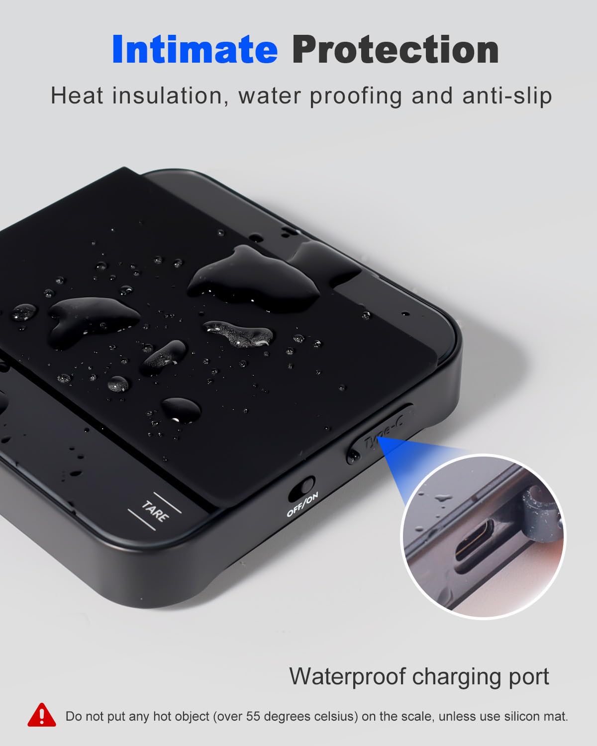 - Elegant & Functional Design: Lamido coffee scale features a sleek, minimalist design with a tempered glass top. Its seamless surface ensures waterproofing and easy cleaning. It has a stunningly clear LED display and touch-sensitive controls. Additionally, it includes a detachable silicone pad that provides waterproofing, slip resistance, scratch resistance, and heat insulation
