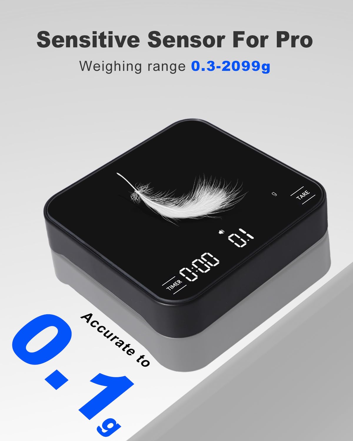 - High Precision Sensor: This electronic scale can be accurate to 0.1 grams, the weighing range from 0.3 grams to 2099 grams, and the built-in single-point aluminum bar sensor guarantees ultra-fast response and precise measurements