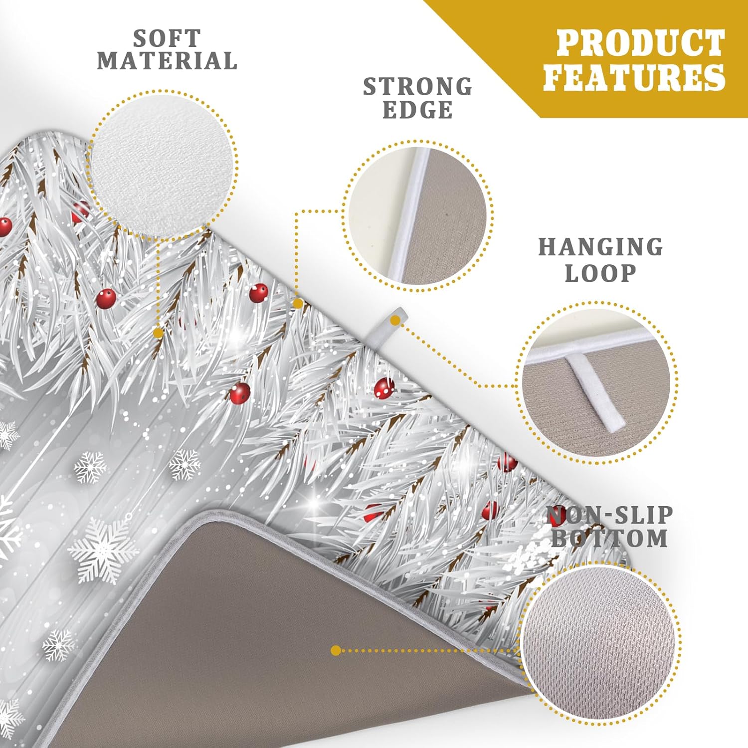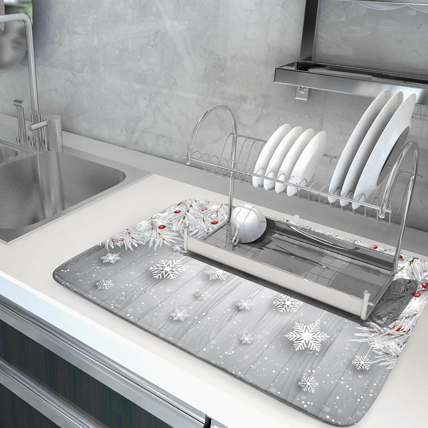 Giwawa 18"x24" Winter Snowflakes Dish Drying Mat Christmas Holly Berries Silver Falling Snow Dish Drainer Mats Absorbent Fast Dry Microfiber Dish Drying Pad for Kitchen Countertop Decor Large