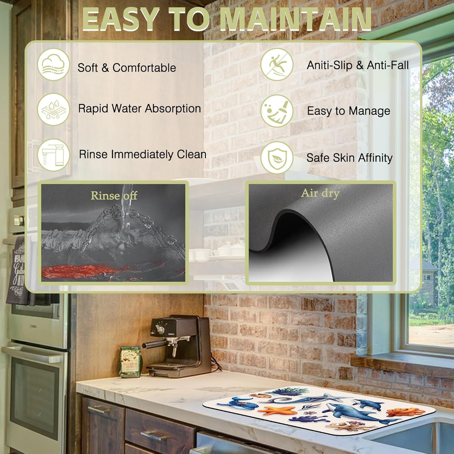 Sea Animals Dish Drying Mat Dolphins Starfish Anemones Kitchen Mat 16"x24" Bsorbent Coffee Maker Mat for Dishes,Utensils Coffee Maker Pots and Pans Easy Clean Dish Slip Resistant Pad