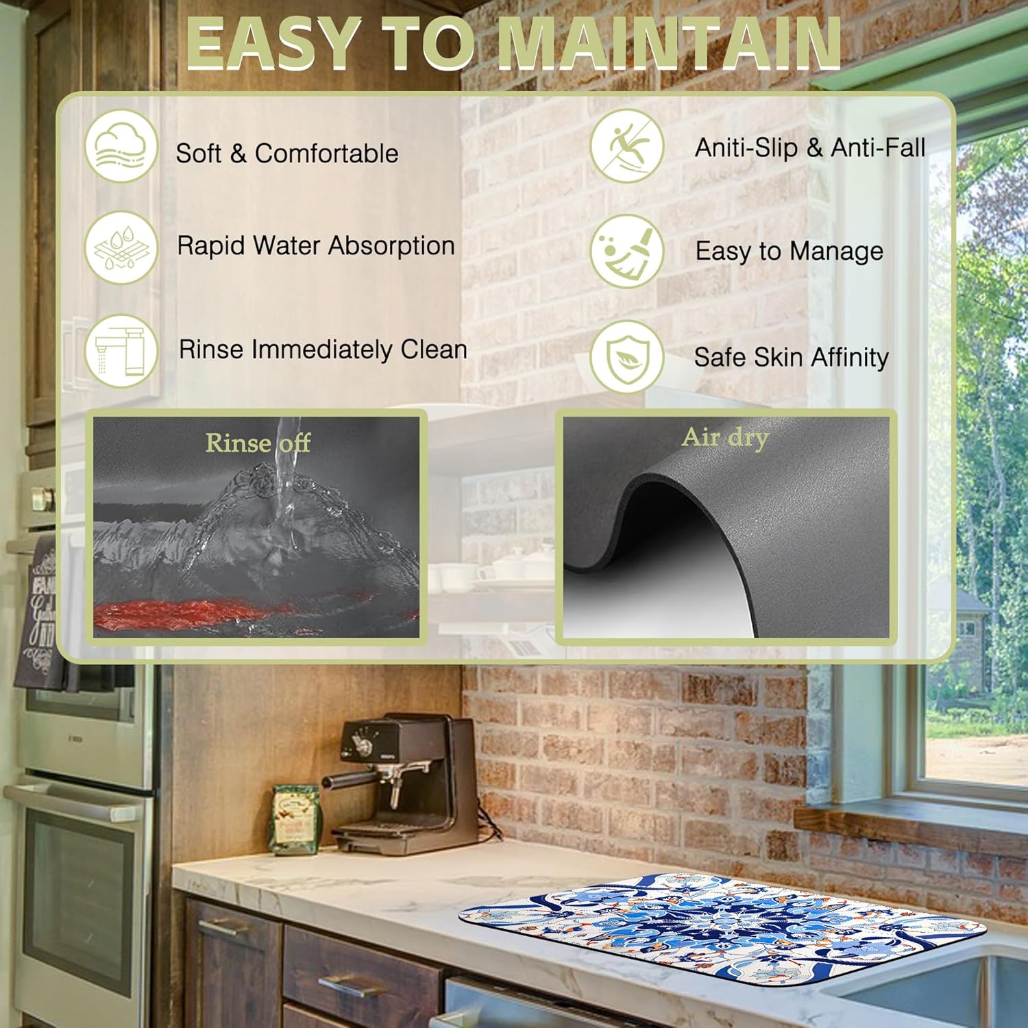 - Material and sizes:This kitchen mat is made of absorbent suede,diatom mud and non-slip rubber,two sizes:12" X 19" and 16" X 24" it fits most counters