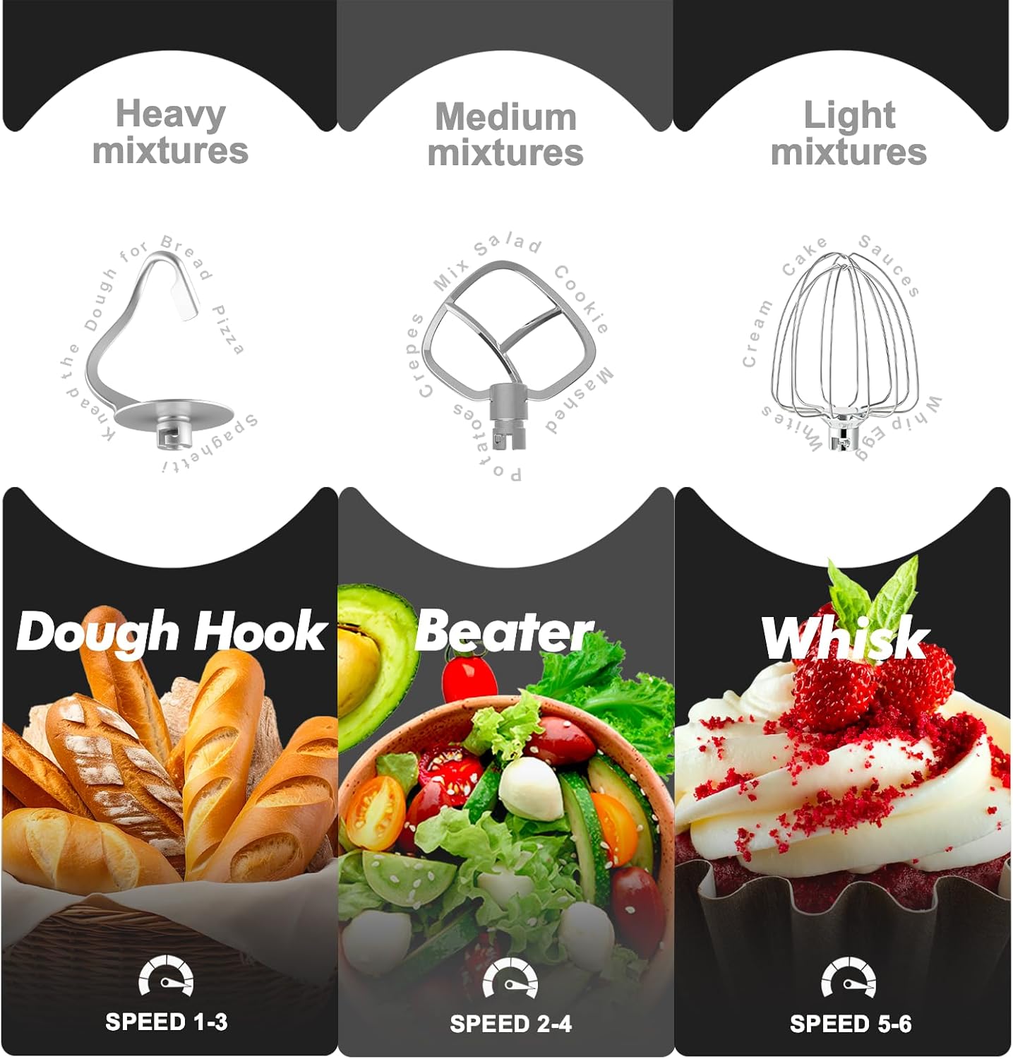 - 6.5QT Mixing Bowl with Handle: Our stand mixer has a 6.5QT stainless steel mixing bowl, which is ideal for mixing and cooking a variety of ingredients, sufficient capacity to make various types of bread; cookies; pizza; cream cakes and mix salads