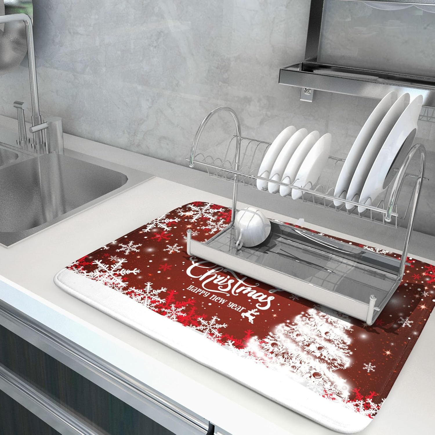 - 1【High Quality Material】:Our red merry christmas drying mat is made of high absorbent microfiber and the middle is made of composite spongedurable, reversible do not fade and comfortable. At the same time, it can protect your kitchen counter from scratching by the tableware.