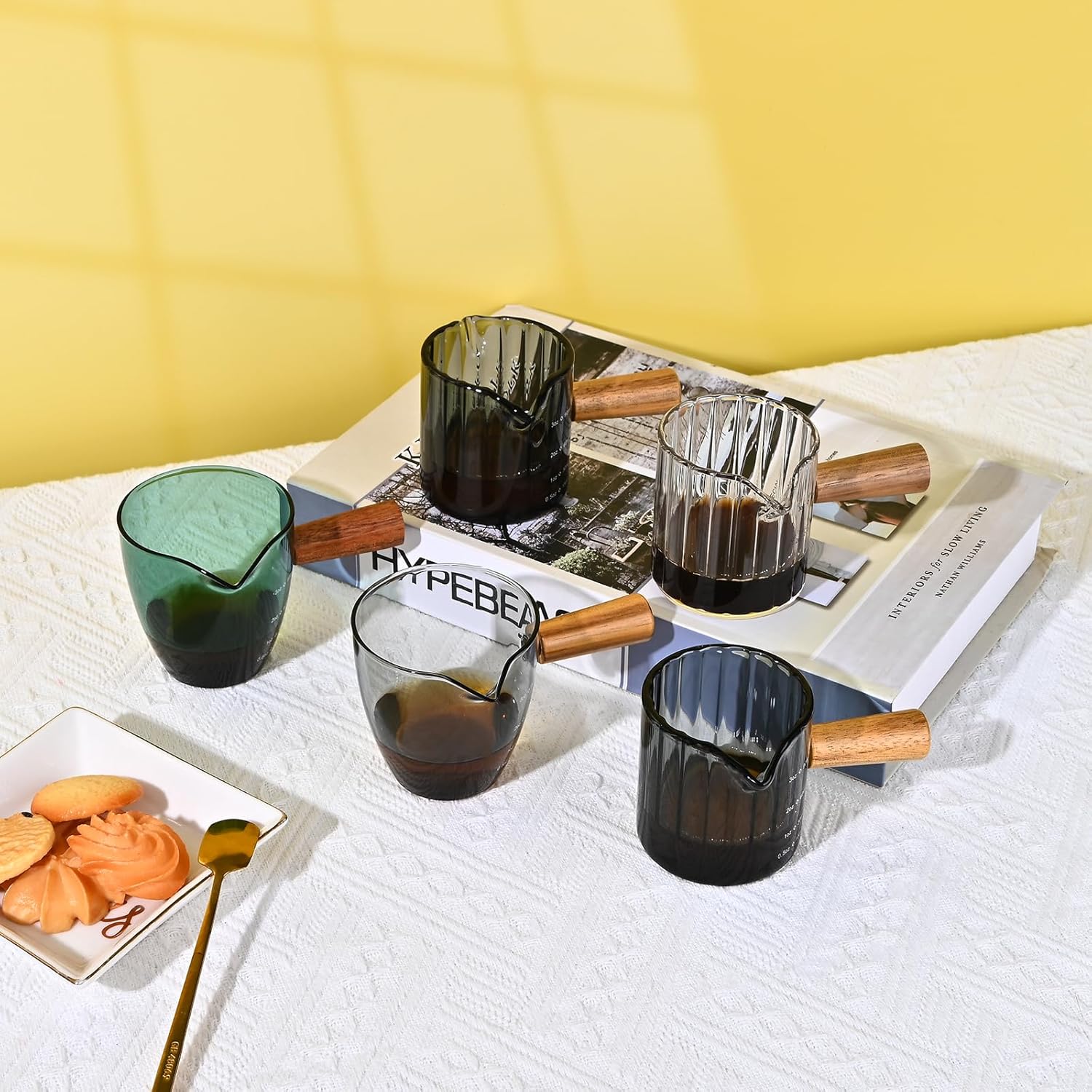 Glass Measuring Cup, 3oz Espresso Shot Glass with Wood Handle, Single Spout Clear Measuring Cups Pitcher Milk Cup Coffee Shot Glasses (Transparent Ribbed)