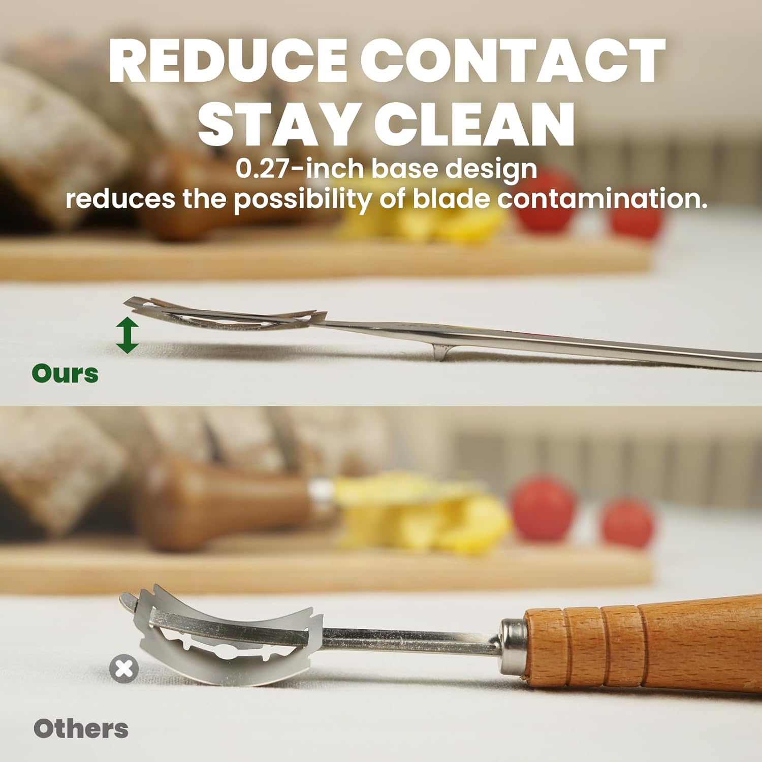 - Small Base Design: The addition of the base offers three key benefits. First, it prevents the blade from touching the surface, keeping it clean. Second, it makes the tool easier to pick up. Finally, during use, your fingers can press against the base to prevent slipping and avoid accidental cuts, it's safe scoring knife for bread baking