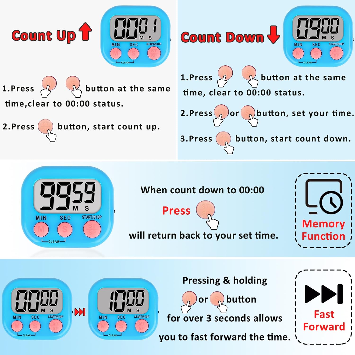 - Easy to use: Digital Timer can use for countup/countdown. With three simple buttons, anyone can learn to use them. The memory function will automatically remember the countdown settings.