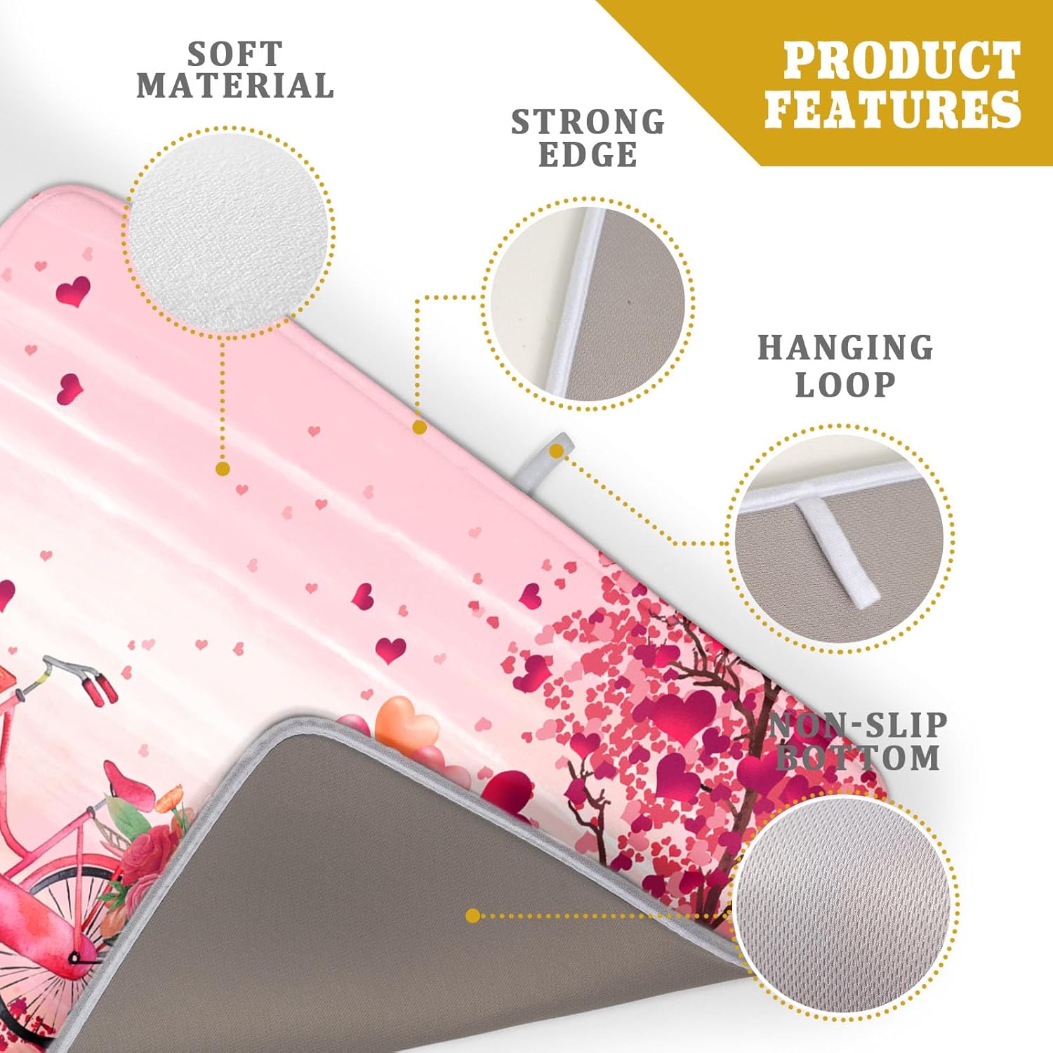 - 3【Unique Design】: Pink love tree dish mat with vibrant bicycle and gnomes patterns, which can add more love spirit to your kitchen office or coffee bar counter. The drying mat for kitchen counter with unique hanging rope design that can be hung without occupying any space,soft and foldable, easy to store.