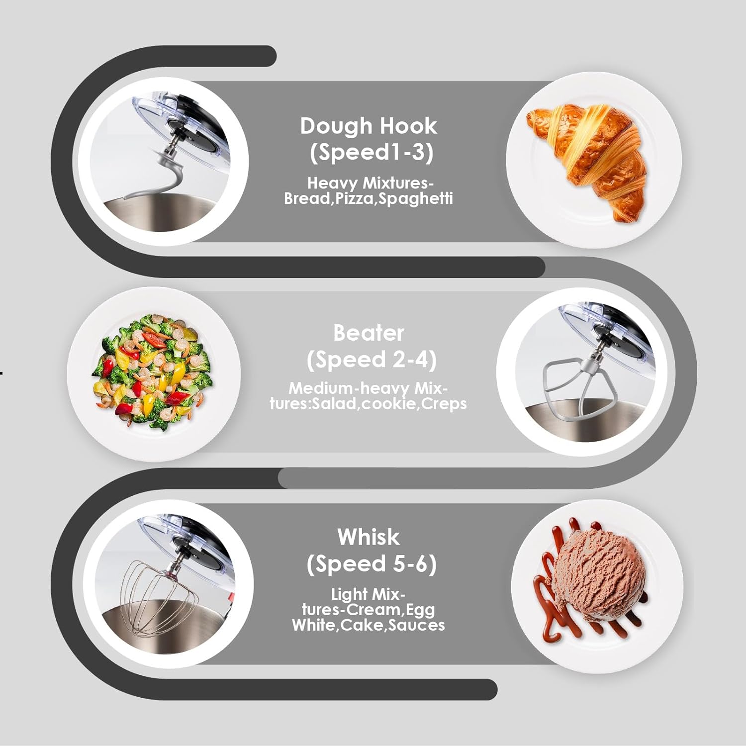 - Upgraded Accessories & Dishwasher Safe: This food mixer comes with a dough hook and flat beater made of aluminum with a protective layer, as well as a stainless steel whisk, all designed for easy use and high durability. The upgraded attachments are dishwasher-safe, allowing for quick and easy cleaning after use.