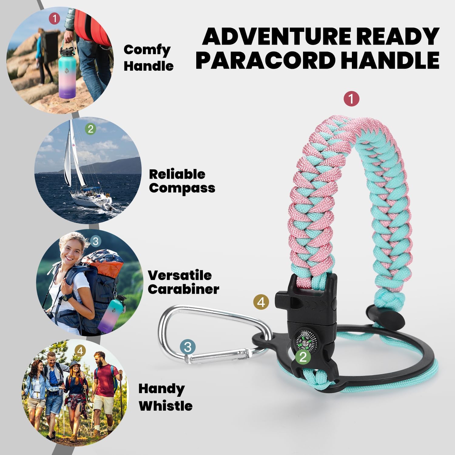 - Iconic Paracord Handle: This insulated water bottle comes with a beautiful hand knit nylon paracord in coordinated color with the water bottle. Configured with a compass and carabiner, this paracord handle is a must-have as a full functional camping / hiking flask