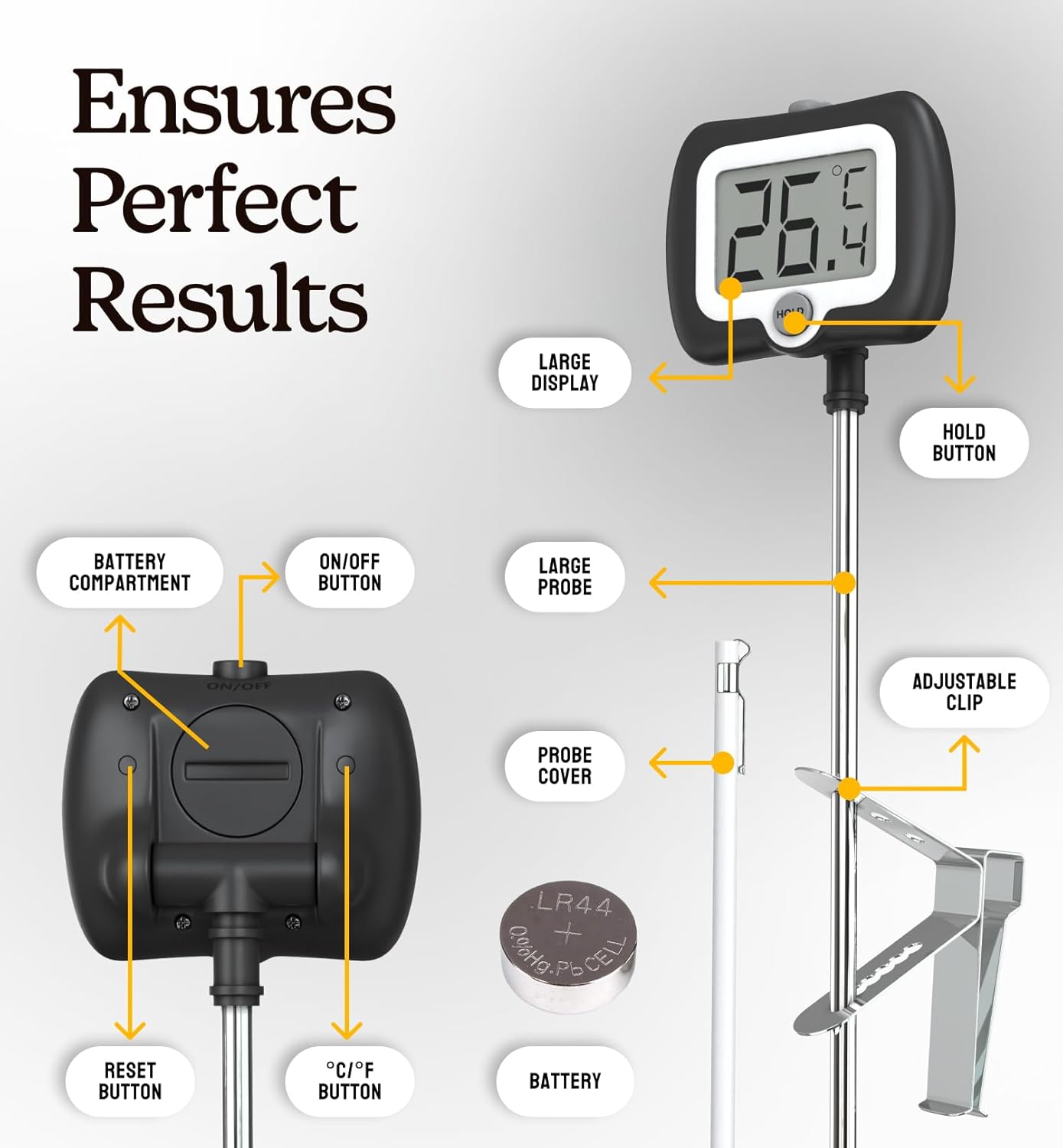 - Pot Clip Design for Safer Operation: This candy thermometer digital with clip can be fixed to the pot so you can free your hands to focus on the cooking, and protect your hands from the hot