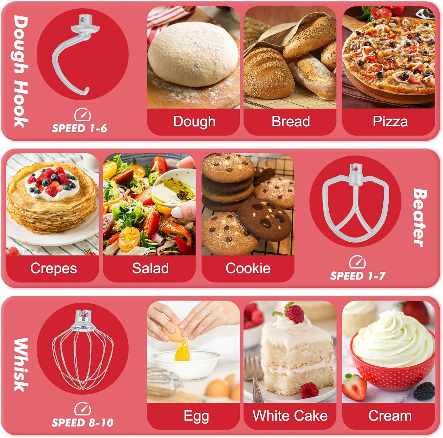 - 10 Speeds and Tilt Head Design - This small kitchen mixer has 10 different speed options,suitable for mixing bread dough, thick batters, meringues, and whipping cake cream, plus lower speeds for stirring and finessing your most delicate concoctions,could suit perfectly to different ingredients. Tilt-head design mixer allows access to install or uninstall bowls and accessories easily.
