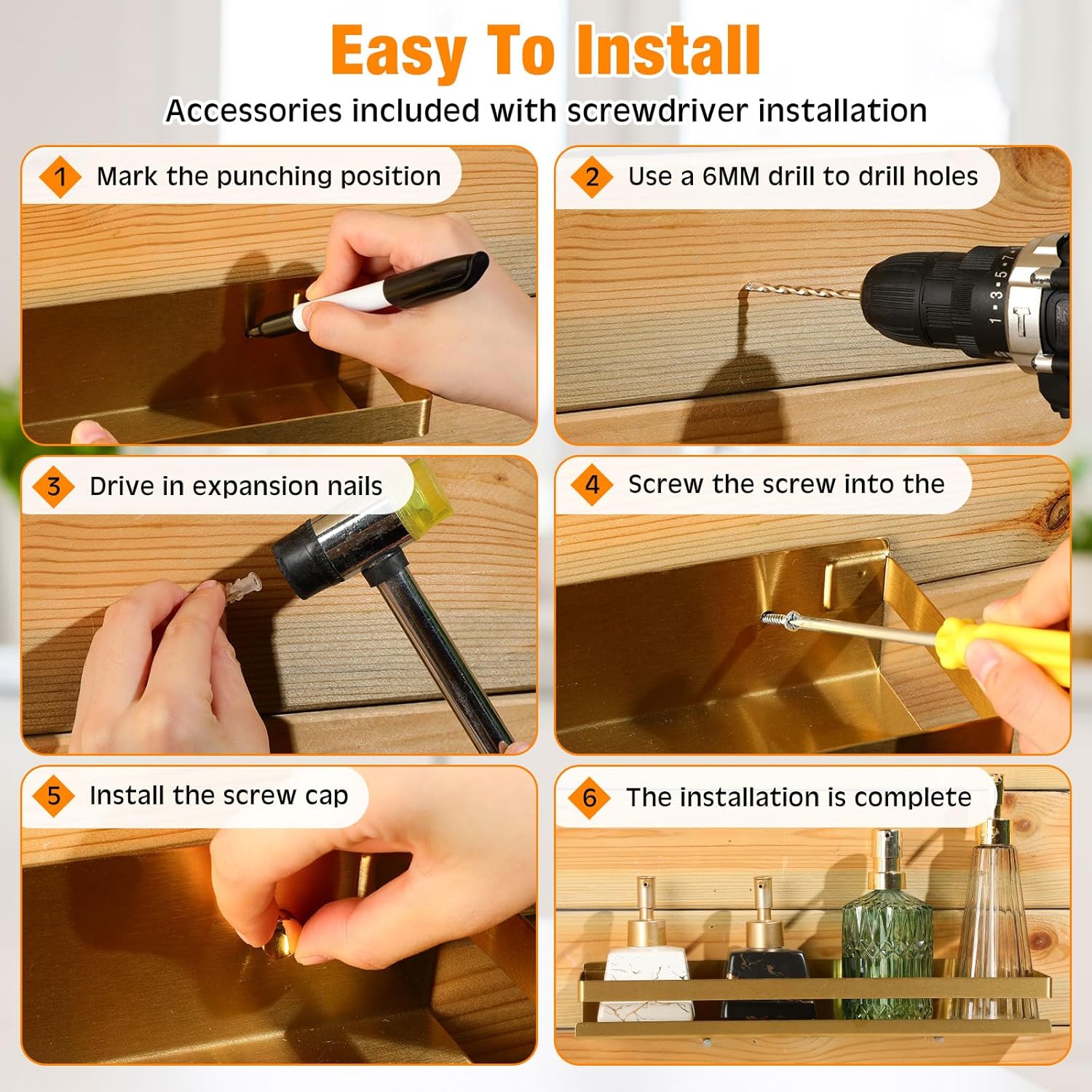 - Simple to Install: shower caddy gold comes with installation accessories, you need to drill the holes first, then drive in the plastic expansion strips, screw in the screws with a screwdriver (not included), install the hidden cover, and the installation is complete; Hidden covers help hide screws for a more esthetical and pleasing look, both decorative and practical